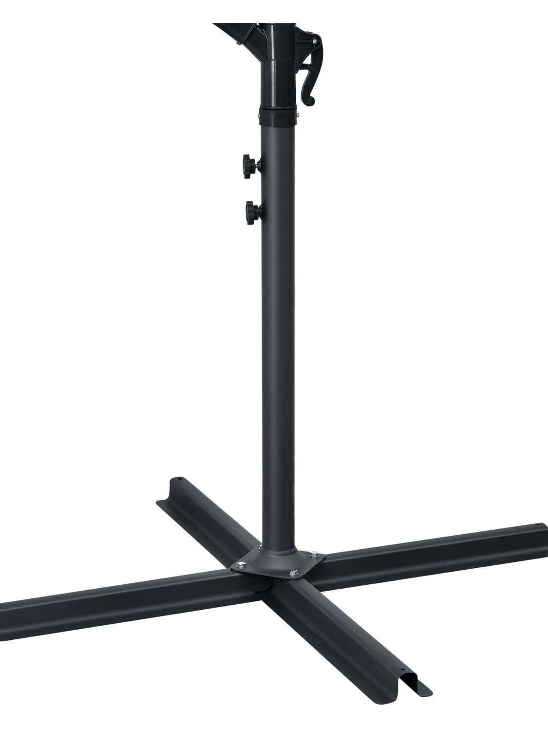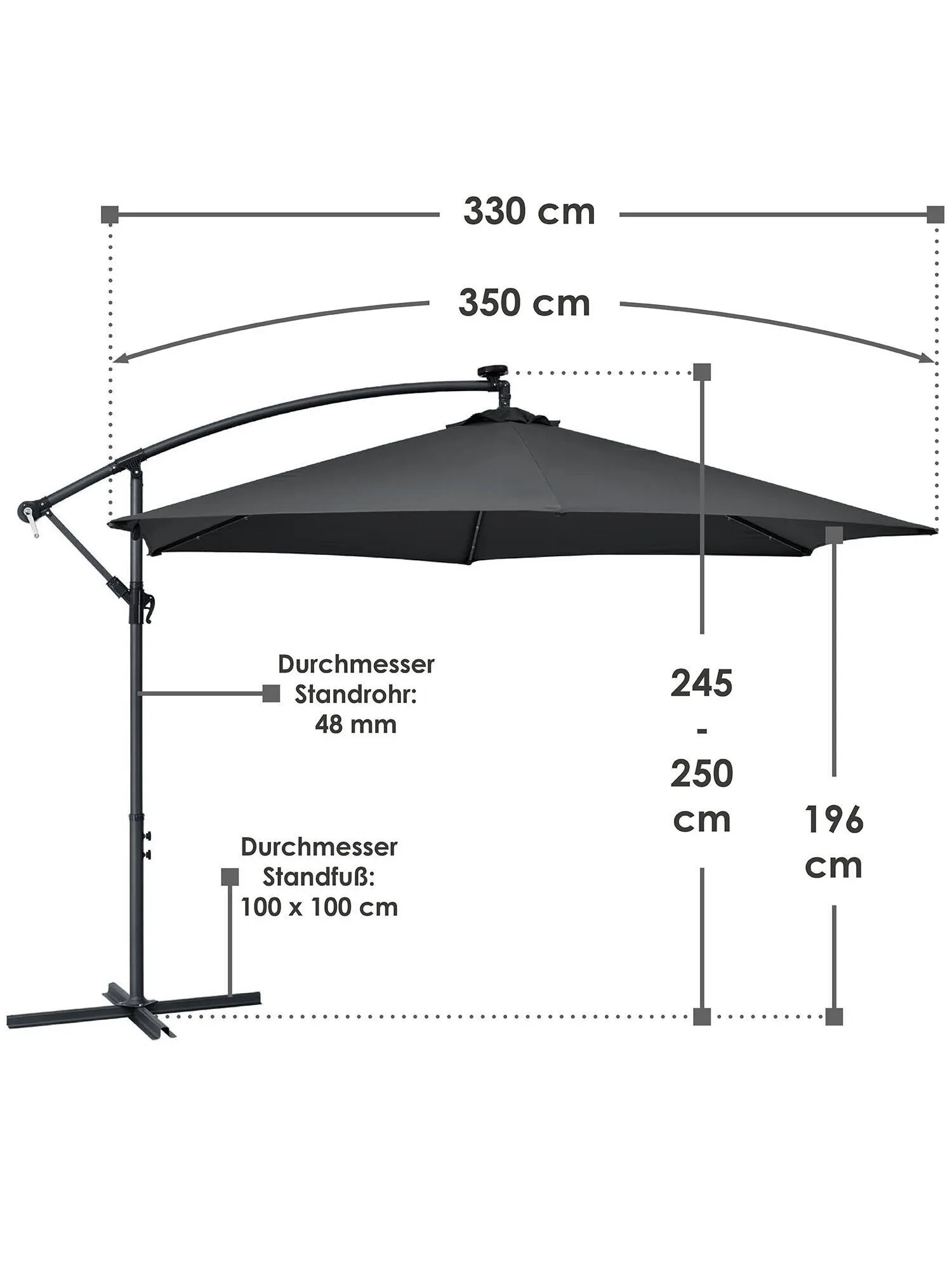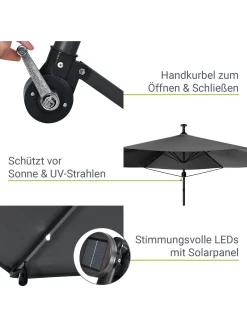 Bei Dunkelheit sorgt die stimmungsvolle LED-Beleuchtung mit 24 Lampen für eine angenehme Atmosphäre im Garten. Dank des leichtgängigen Kurbelsystems lässt sich der Schirm kinderleicht öffnen und schließen. Die robuste Stoff-Bespannung aus wasserabweisendem Polyester schützt Sie vor Sonne und UV-Strahlung, während der stabile Standfuß in Kreuzform aus pulverbeschichtetem Stahl für sicheren Halt auf nahezu jedem Untergrund sorgt.