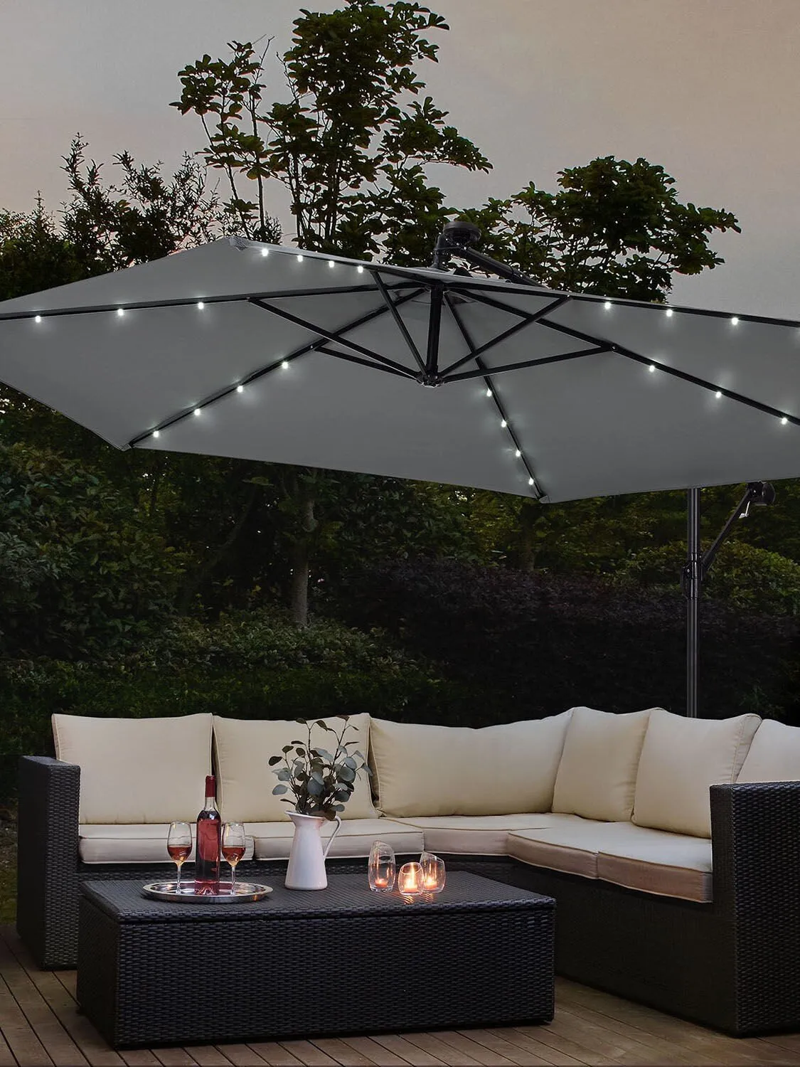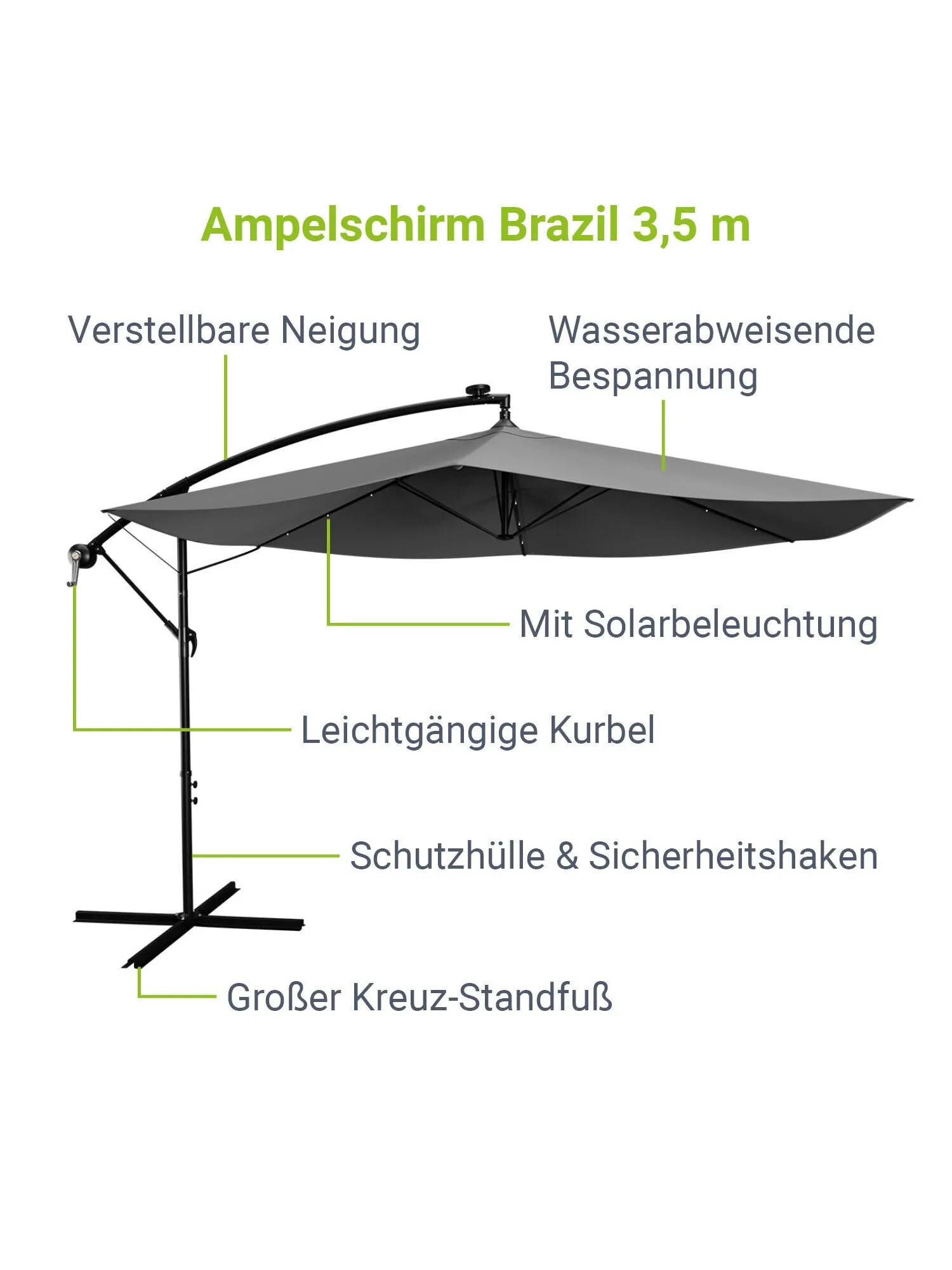 Genießen Sie den Sommer im Freien mit dem trendigen Ampelschirm Brazil Ø 3,5 m mit LED-Beleuchtung.