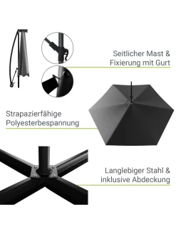 Der seitlich angebrachte Arm ermöglicht eine optimale Nutzung der Fläche unter dem Schirm, während die stufenlose Neigungsfunktion es Ihnen ermöglicht, den Schirm mühelos an den Sonnenstand anzupassen.