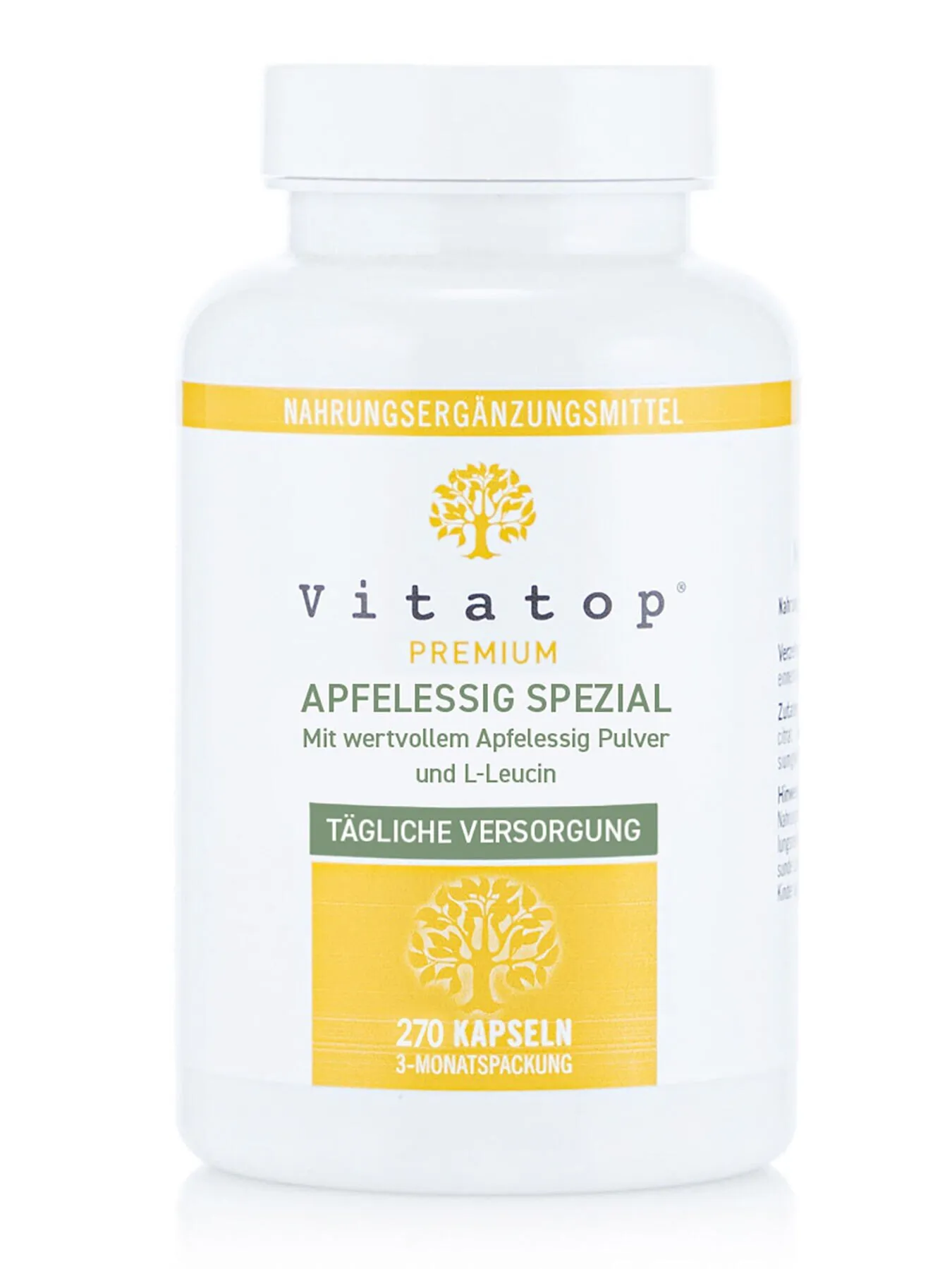 Vitatop® APFELESSIG SPEZIAL ist ein hochwertiges Nahrungsergänzungsmittel, das aus wertvollem Apfelessig und der Aminosäure L-Leucin besteht. Es wird unter höchsten Qualitätsansprüchen hergestellt und ist glutenfrei, lactosefrei und gelatinefrei.