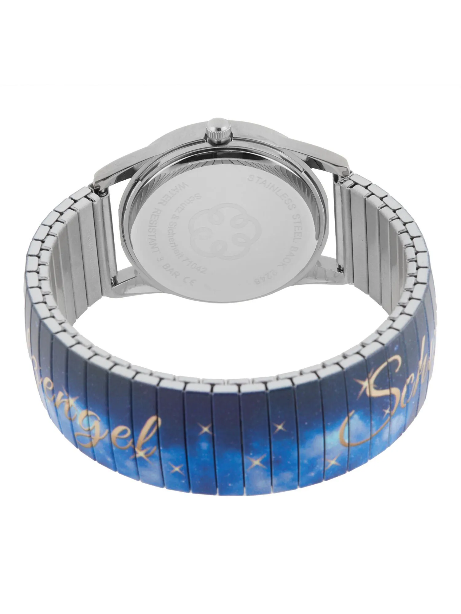 Die Armbanduhr „Schutzengel“ prĂ€sentiert sich als eleganter Zeitmesser mit einem nachthimmelblauen Zifferblatt und Mondphasenanzeige. Die Uhr ist wasserdicht bis 3 Bar und verfĂŒgt ĂŒber eine einzigartige Energiespirale, die anstelle der 12 auf dem Ziffernblatt edel im goldenen Schimmer thront. Das flexible, dehnbare Armband ohne Verschluss bietet hohen Tragekomfort. Der goldene Schriftzug „Schutzengel“ am Armband verleiht der Uhr eine persönliche Note. Stilvoll und funktional.Â