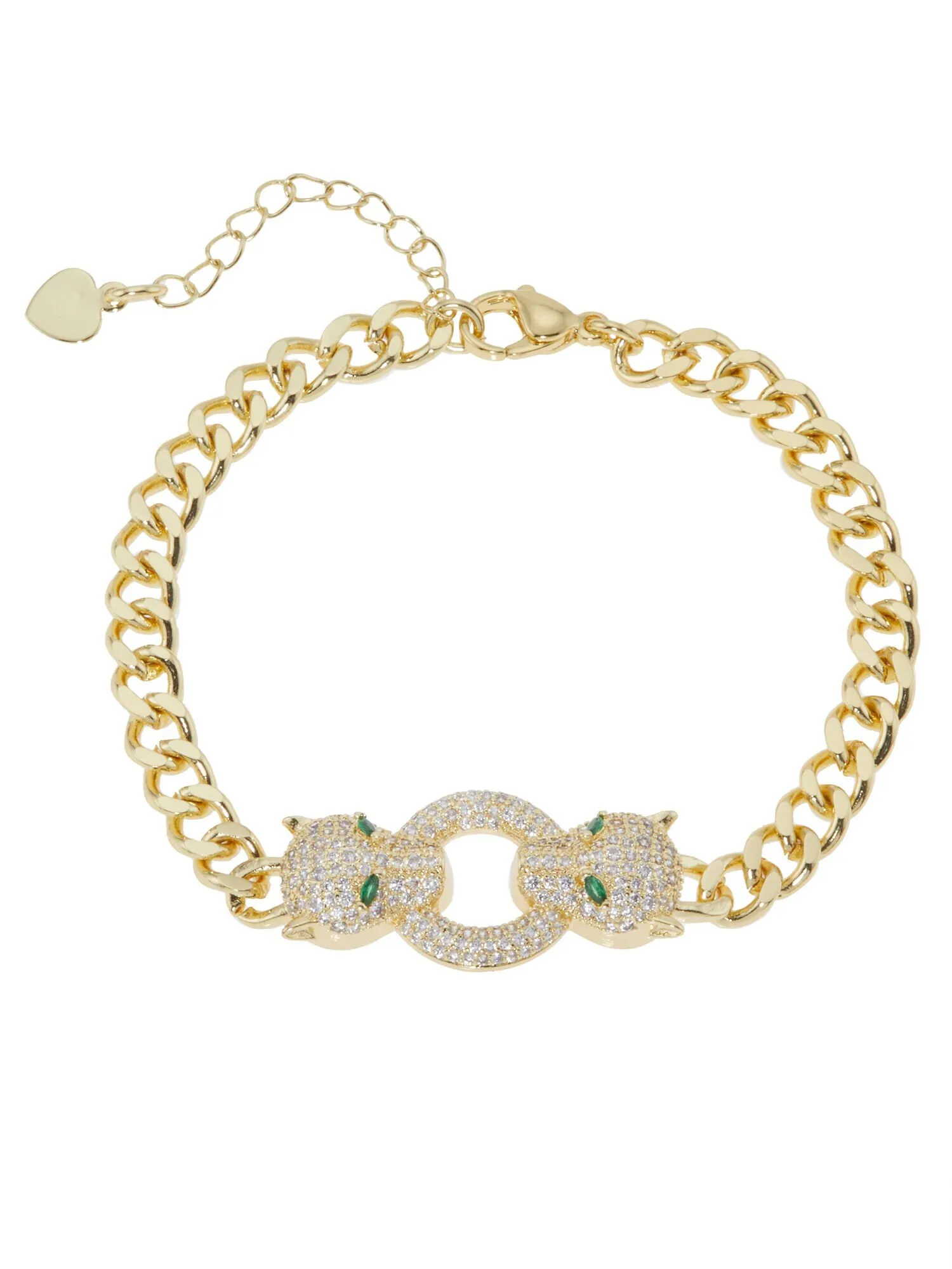 Tauchen Sie ein in die faszinierende Welt des „Wild Cat“ Armbands, einer kĂŒhnen Fusion aus Eleganz und Wildheit. Dieses einzigartige Armband ist vergoldet und verkörpert die majestĂ€tische Schönheit eines Panthers in jedem Detail. Die Köpfe der Panther sind mit funkelnden, weiĂen Zirkonia besetzt, wĂ€hrend die intensiven grĂŒnen Zirkonia den undurchdringlichen Blick des Panthers widerspiegeln. Verleihen auch Sie Ihrem Look einen Hauch von Wildheit und Dynamik.Â