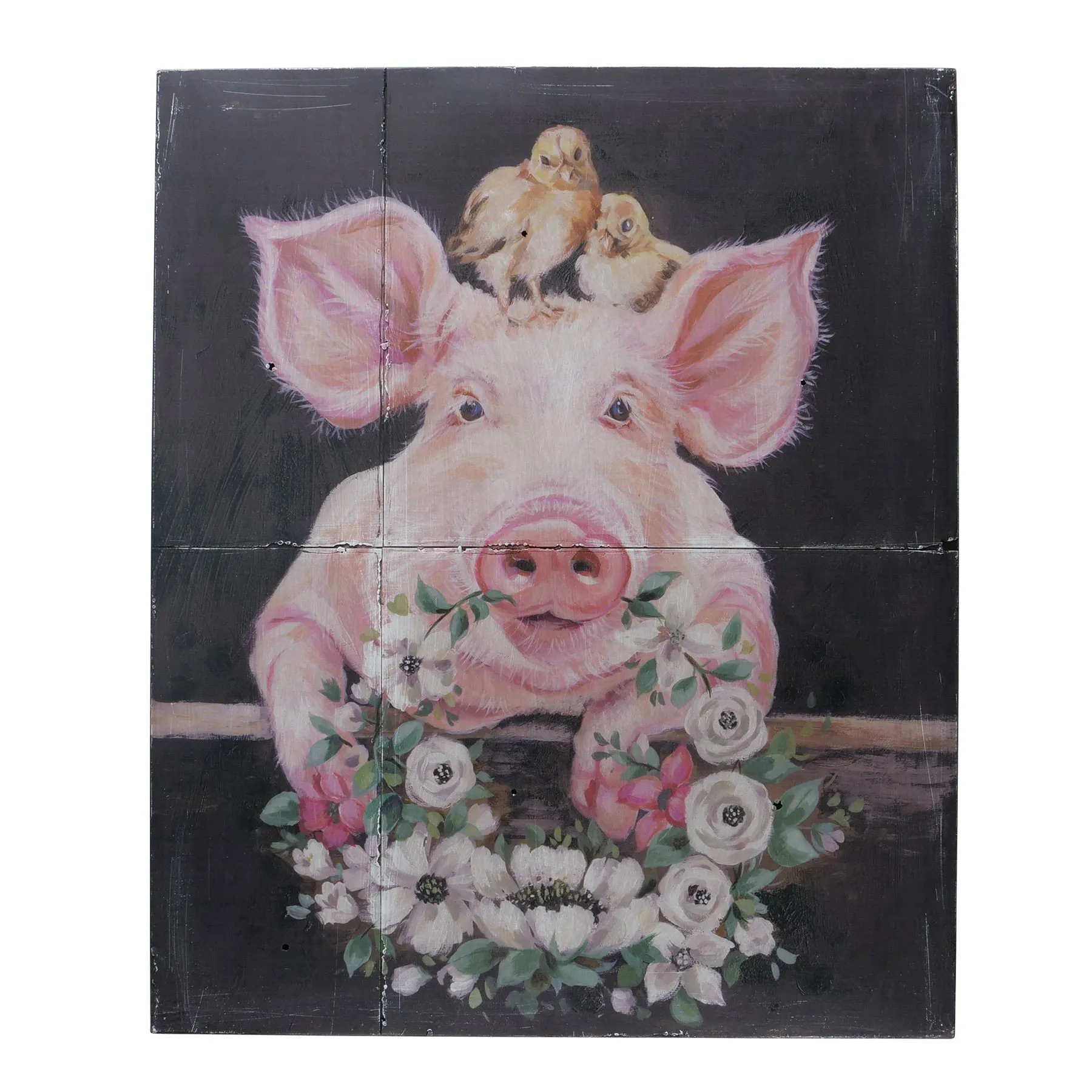 - Motiv: Schweinchen mit Blumenkranz und zwei Küken