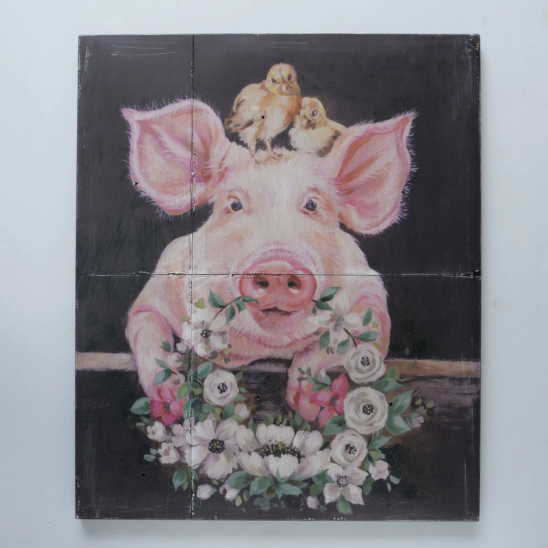 So bezaubernd kann Kunst sein. Das Bild Urli kann nicht anders, als seinem Betrachter ein Lächeln auf die Lippen zu bringen. Das Kunstwerk wird von einem süßen Schweinchen geziert, dass einen traumhaft schönen Blumenkranz in der Schnute hält. Wie eine herrlich warme Begrüßung schaut es aufmerksam auf den Betrachter und lädt einen ein, sich wohlzufühlen. So ist das Bild z. B. perfekt für den Eingangsbereich oder den Flur geeignet. Das i-Tüpfelchen bilden die zwei niedlichen Küken auf dem Kopf des Schweinchens, die ebenfalls aufmerksam zu dem Betrachter schauen. Liebevolle Details lassen einem immer wieder auf das Bild schauen.