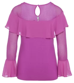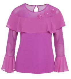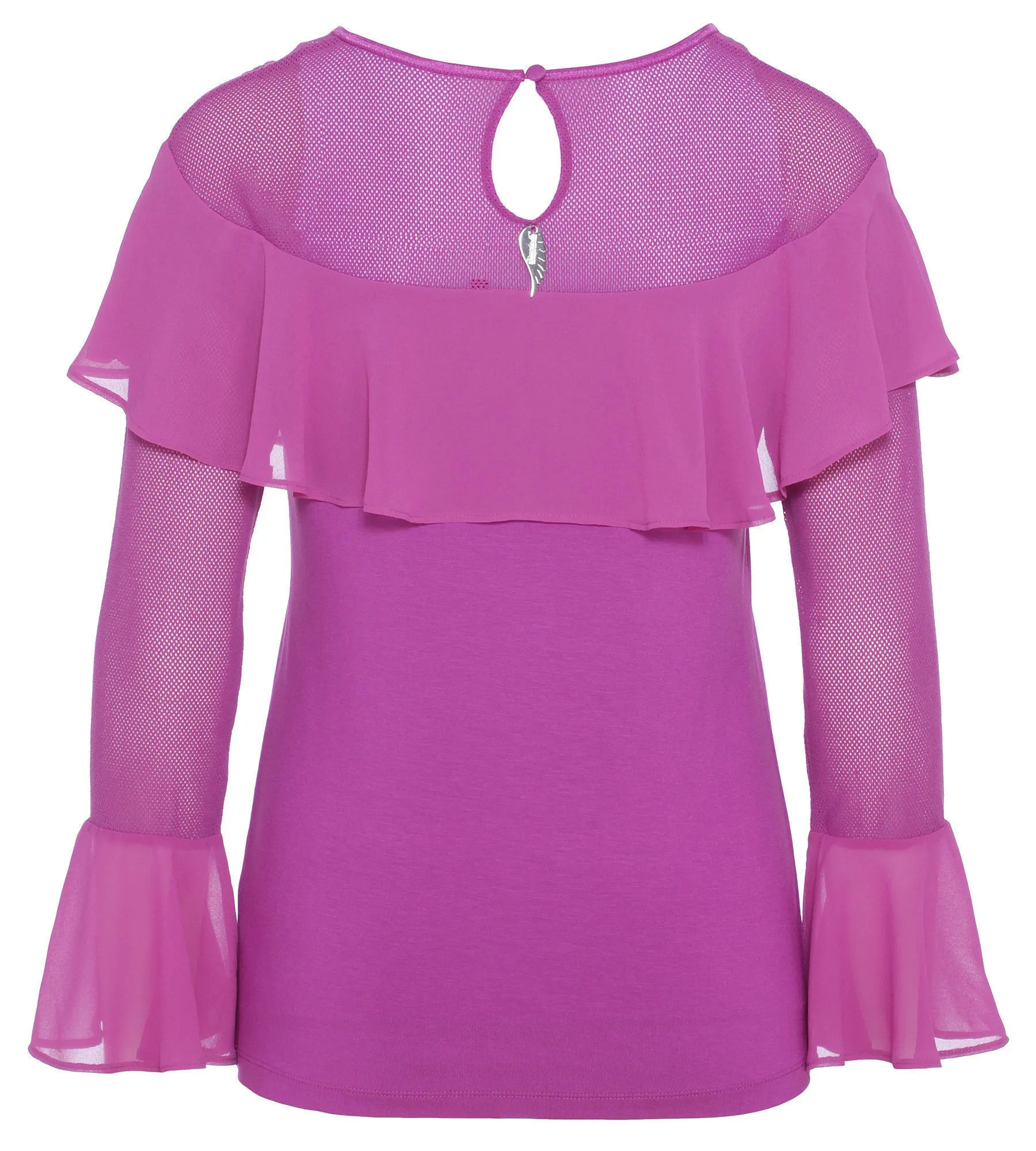 Das verführerische Gipsy Queen Blusenshirt überzeugt mit seinem üppigen Volant im Vorder- und Rückteil im Carmen Stil. Der halsnahe Rundhalsausschnitt, der Netzeinsatz im Dekollette und die Ärmel sind aus tonigem Chiffonvolant. Ein raffinierter Blickfang sind die aufgesetzten Stoffblumen.