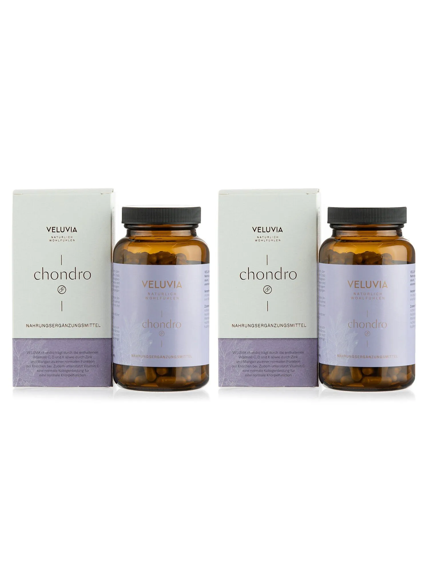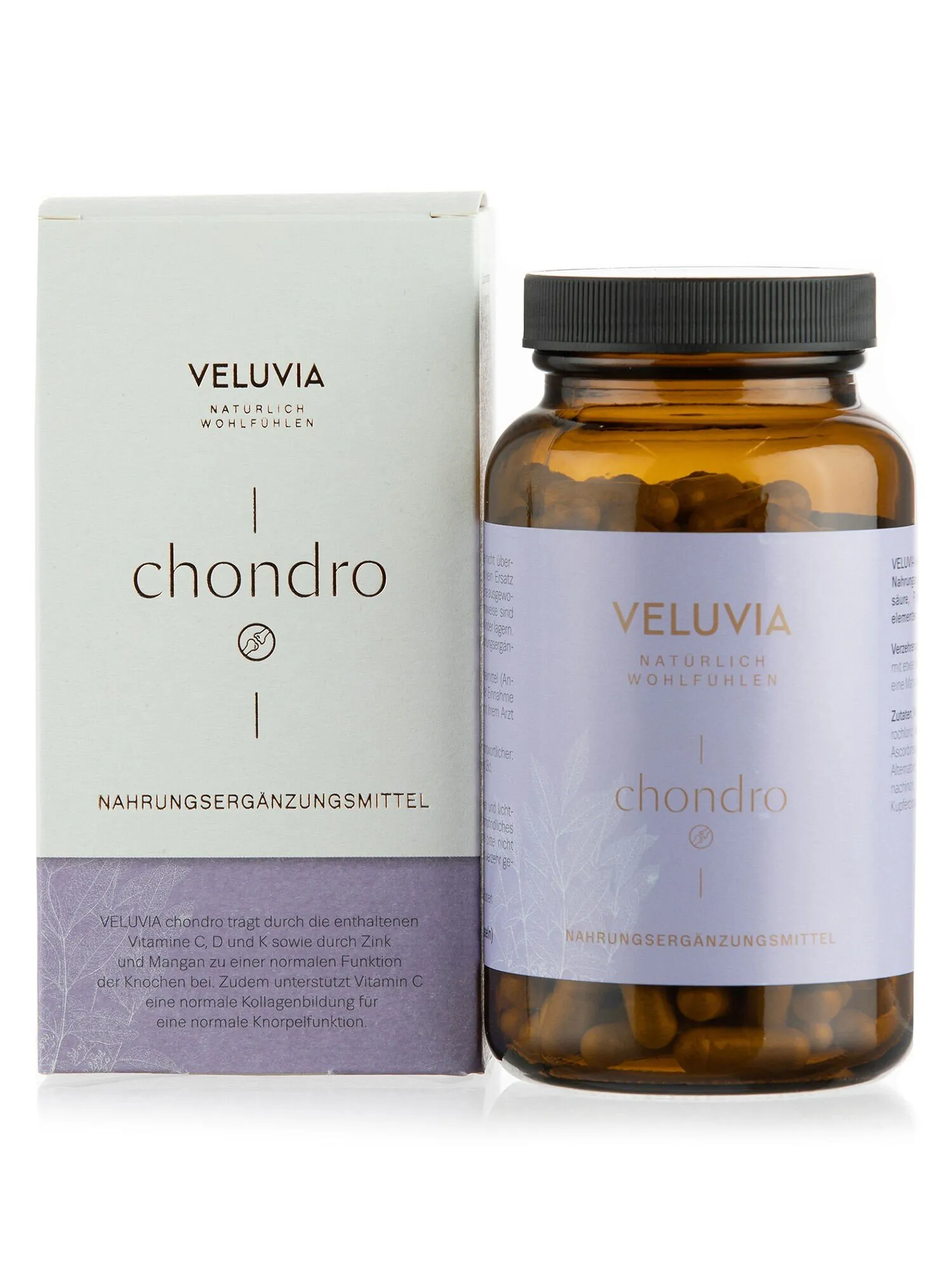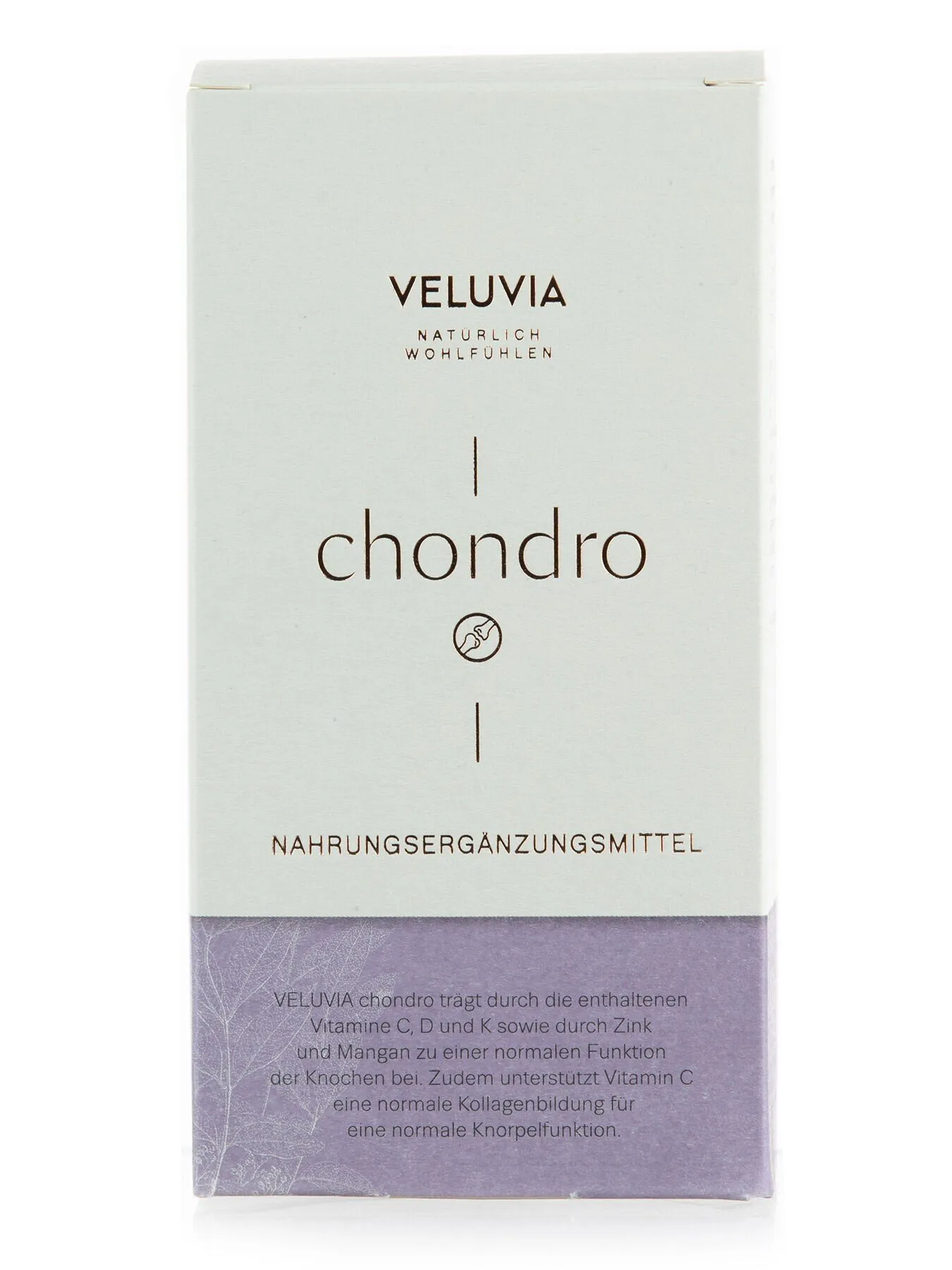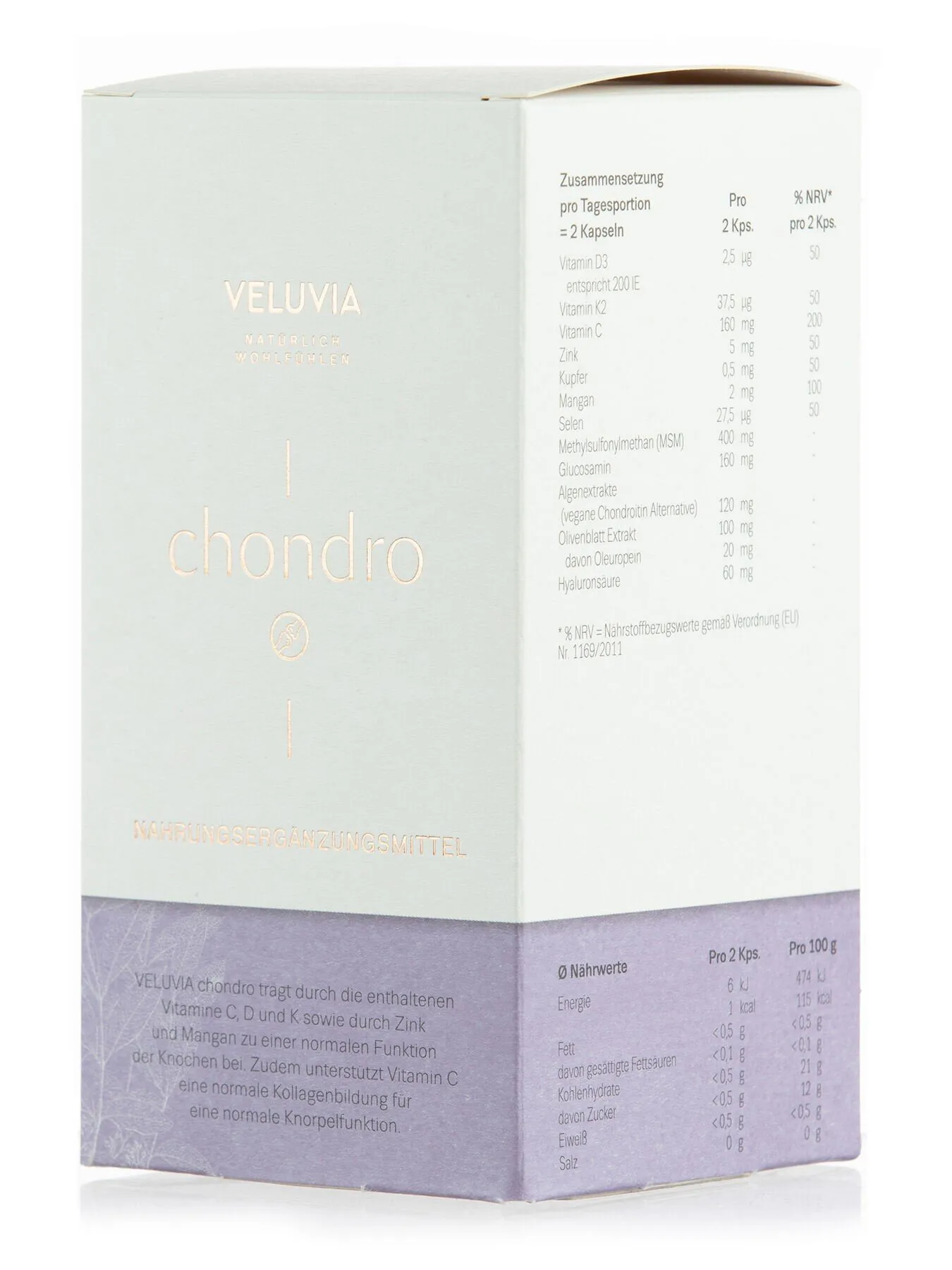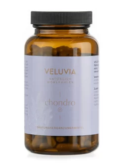 VELUVIA chondro ist ein Spezialkomplex zur Unterstützung der Knorpelfunktion. Die Rezeptur enthält den Markenrohstoff Phytodroitin™ – eine vegane Alternative zu Chondroitin -, wertvolles Glucosamin, Methylsulfonylmethan (MSM), Olivenblatt Extrakt, niedermolekulare Hyaluronsäure sowie einen Vitamin- und Spurenelementkomplex. Die Vitamine C, D und K sowie Zink und Mangan tragen zu einer normalen Funktion der Knochen bei. Zudem unterstützt Vitamin C eine normale Kollagenbildung für eine normale Knorpelfunktion und Mangan trägt zu einer normalen Bindegewebsbildung bei.