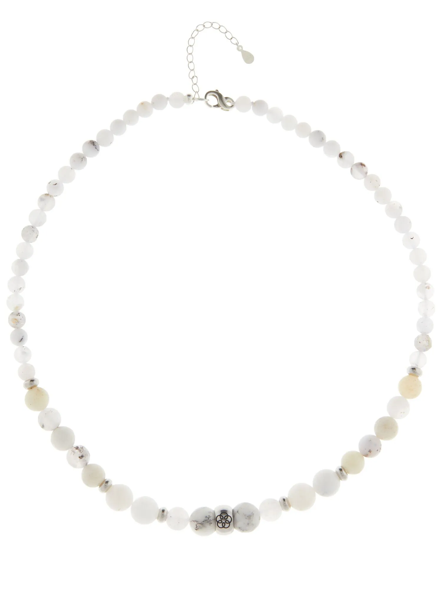 Die Kette besteht aus insgesamt 60 Dendriten-Opalen und besitzt eine Edelstahlkugel, die mit einer gravierten Energiespirale verziert ist. Jeder Stein ist einzigartig und verleiht der Kette ein elegantes WeiĂ mit blĂ€ulichen Nuancen. Diese Kette ist nicht nur ein stilvolles SchmuckstĂŒck, sondern auch ein Ausdruck von Anmut.Â