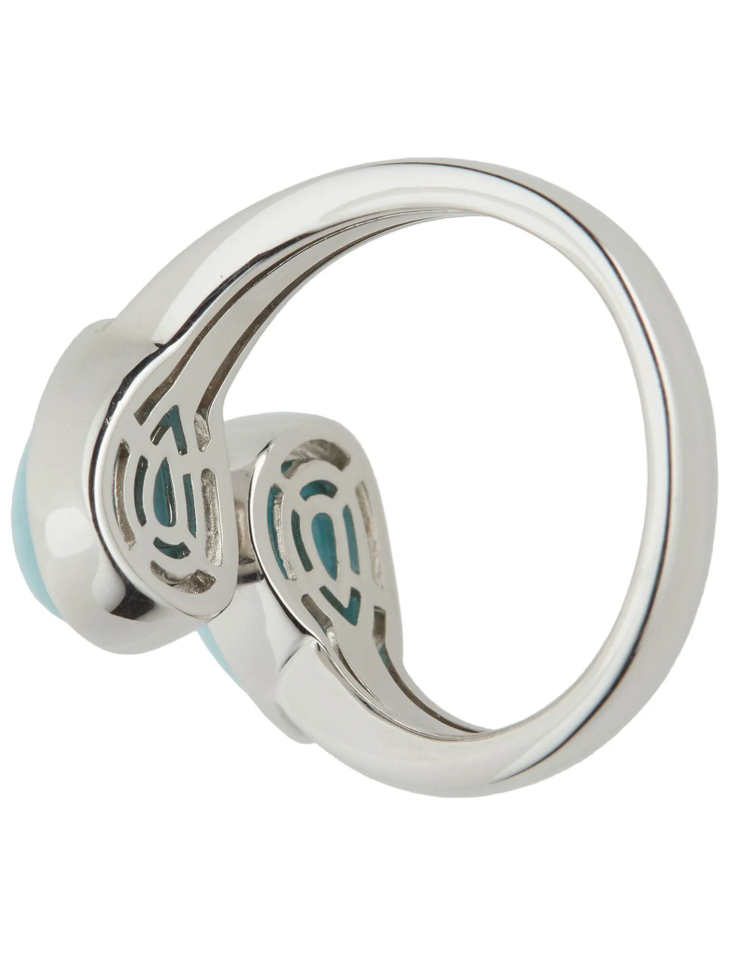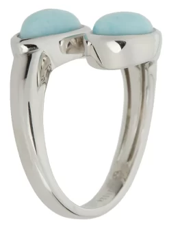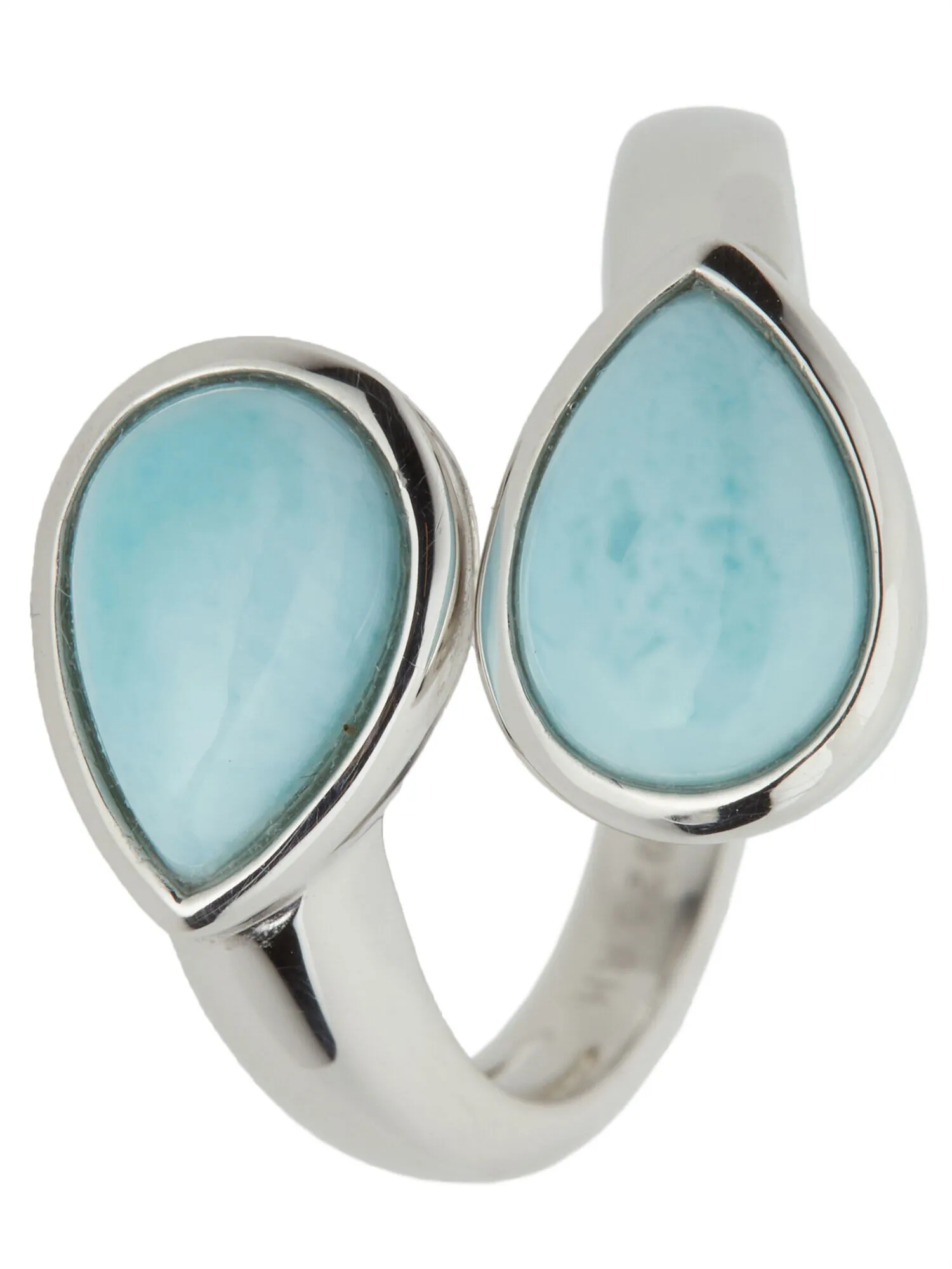 Der CroisĂ©-Ring ist ein einzigartiges SchmuckstĂŒck aus rhodiniertem und poliertem Silber 925. Sein breiter Ringkopf von ca. 12,0 mm trĂ€gt zwei himmelblaue Larimar-Steine in Tropfen-Cabochon-Schliffen mit einem Karatgewicht von ca. 3,80 ct.. Jeder Stein besitzt eine AA-Reinheit und verleiht dem Ring eine Aura von Eleganz und Raffinesse. Mit einem individuellen Zahlenschwingungscode versehen, ist dieser Ring ein Symbol fĂŒr Schönheit und Mystik.