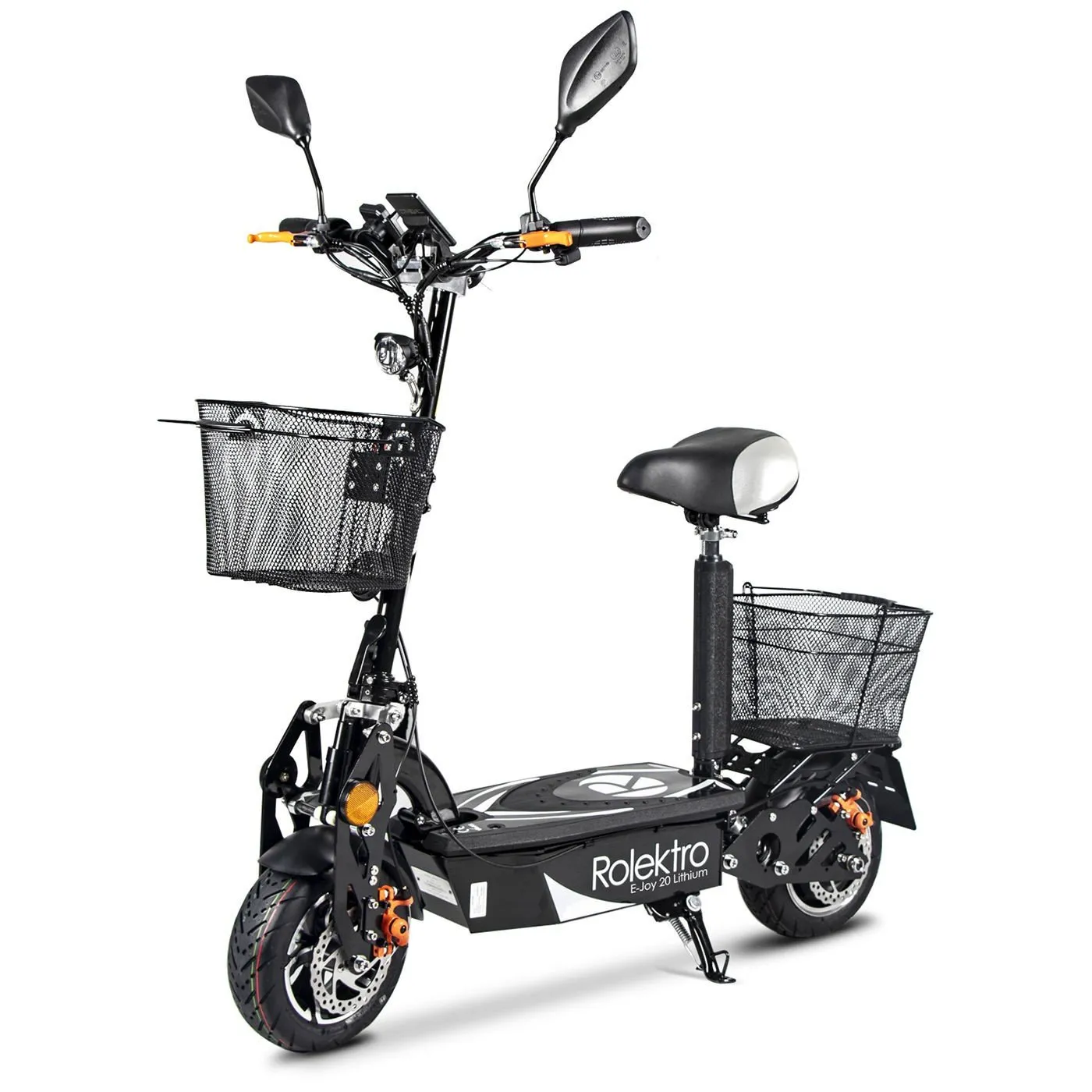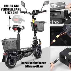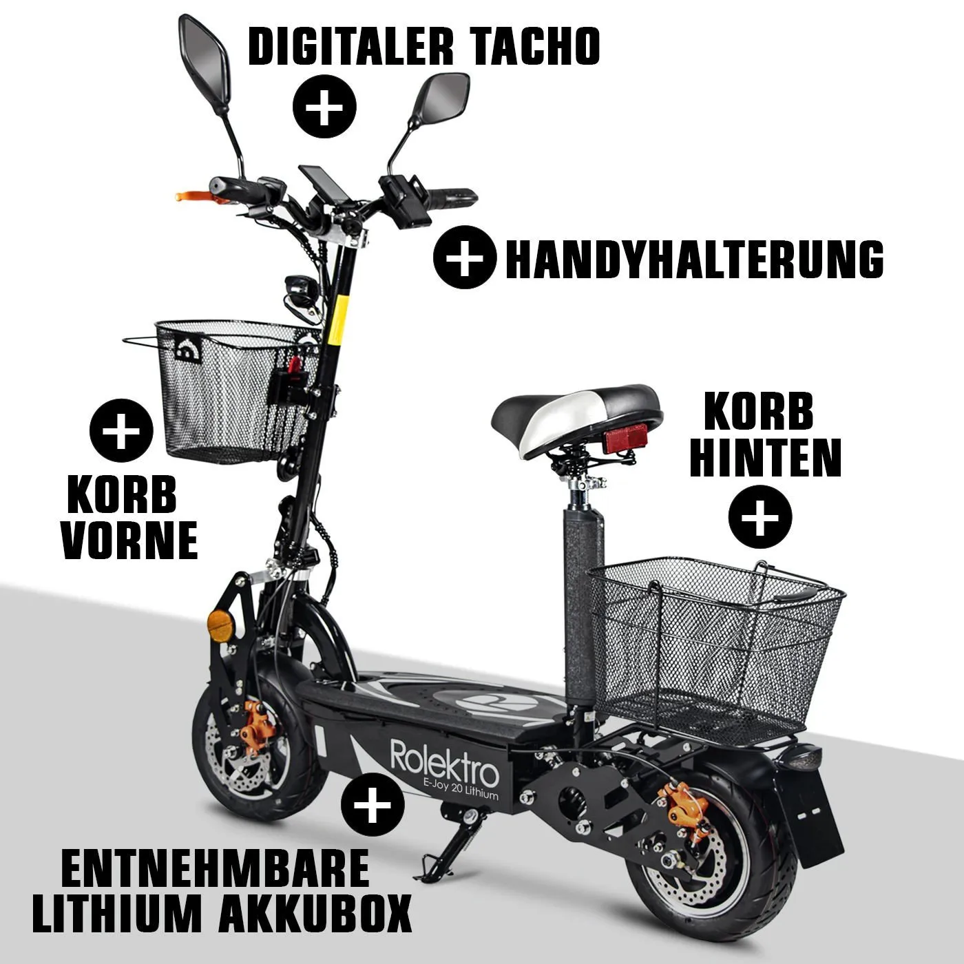 Der kleine E-Scooter wird voll ausgestattet geliefert – mit zwei Körben, Akku-Box und Ladegerät!