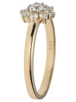 Der Ring ist mit insgesamt 9 Brillanten verziert, die in einem Entourage-Design angeordnet sind. Der größte Brillant in der Mitte wird von 8 kleineren Diamanten umringt, die das strahlende Funkeln dieses Rings perfekt ergänzen. Die Kombination aus edlem Gelbgold und strahlenden Brillanten macht diesen Ring zu einem zeitlosen Schmuckstück.