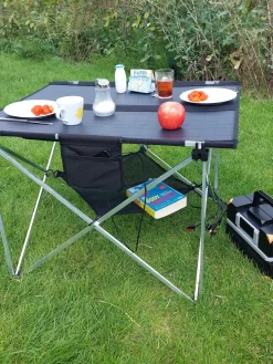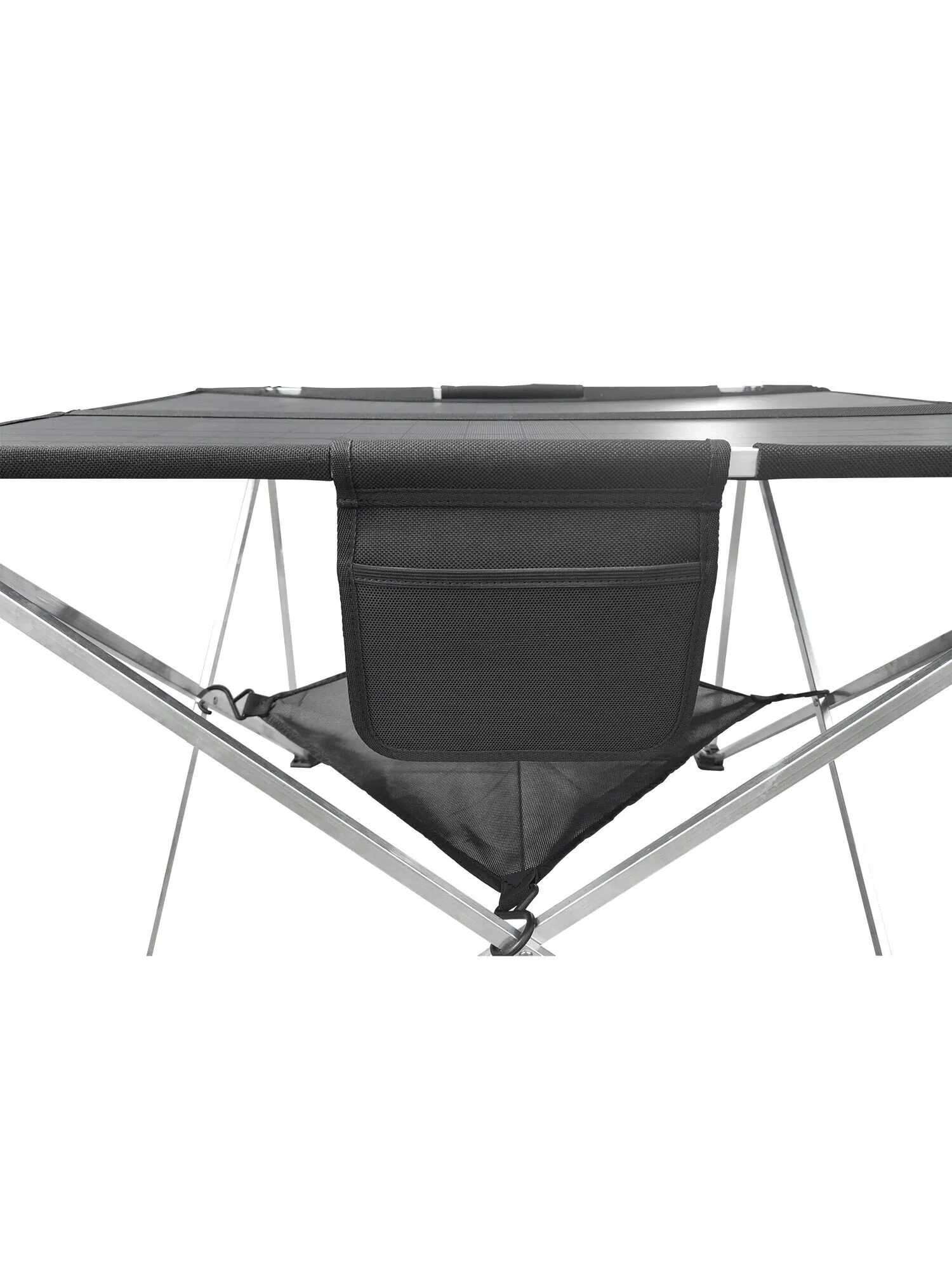 Darüber hinaus verfügt der Tisch über praktische Aufbewahrungstaschen an den Seiten und eine Netztasche unter dem Tisch, um Ihre wichtigsten Gegenstände griffbereit zu halten.