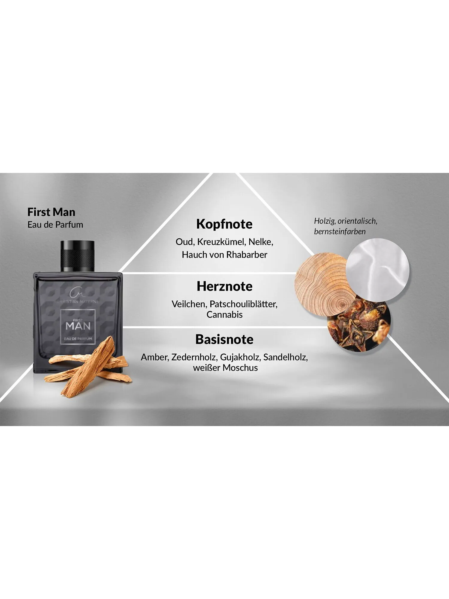 Basisnote: Amber, Zedernholz, Guajakholz, Sandelholz, Weißer Moschus