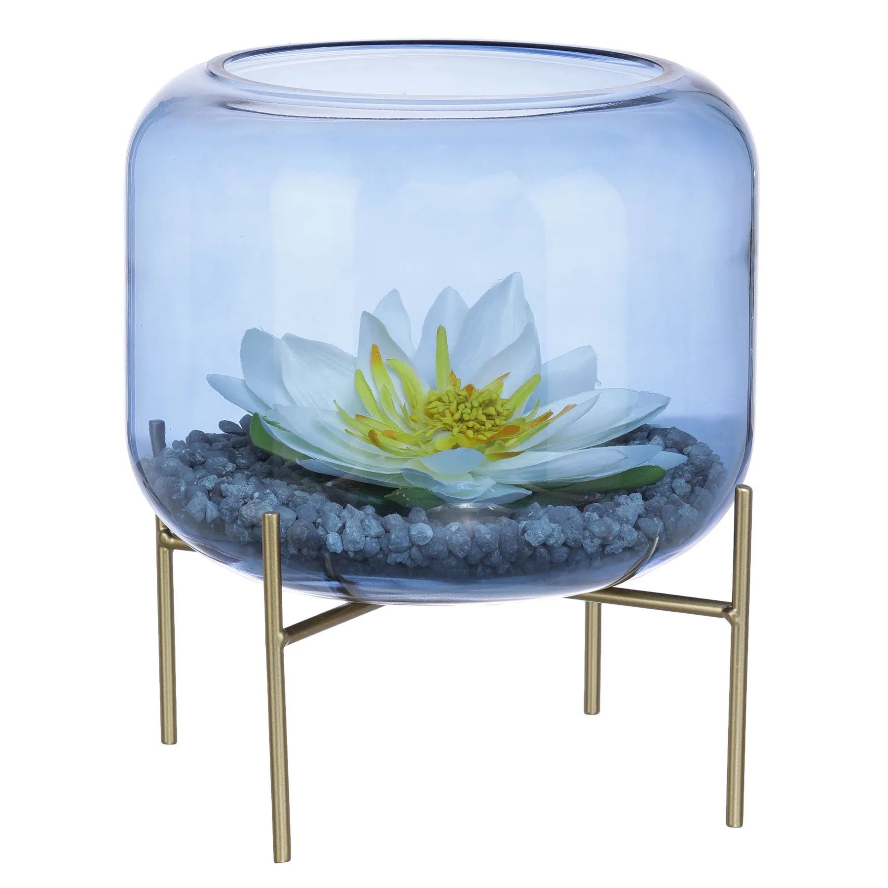 Dieses schicke Dekoelement wird Ihr Herz im Nu erobern! Die Seerose überzeugt mit zahlreichen zarten Blütenblättern, die in einem zarten rosa oder weiß gehalten sind. Die Kunstpflanze ist detailgetreu der Natur nachempfunden, benötigt jedoch keine Pflege. Die Schale wird von einem abnehmbaren Metallgestell gehalten und schimmert im zarten rosa oder blau. Mit Deko-Kies können Sie Ihrer Kreativität freien Lauf lassen. Gestalten Sie nach Lust und Laune immer wieder neu.