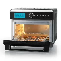 Jede Sünde wert. Im Handumdrehen zaubern Sie mit dem digitalen Heißluft-Ofen leckerste Gerichte. Vom knusprigen Hähnchen zu krossen Pommes frites zu saftiger Pizza ist für jeden Geschmack etwas dabei. Möglich macht es das große Zubehör-Set sowie seine ausgeklügelte Technik. Der praktische Küchenhelfer verfügt wie ein klassischer Backofen über Ober- und Unterhitze sowie Umluft, dabei ist er jedoch sehr viel kompakter als die herkömmlichen Geräte und passt selbst in die kleineste Küchenzeile. Trotz seinem platzsparenden Design füllt er durch seine großzügigen 18 l im Handumdrehen mehre hungrige Mägen mit den unterschiedlichsten Speisen. 12 voreingestellte Programme, eine individuelle Temperatureinstellung sowie eine automatische Abschaltfunktion bringen große Freude beim Zubereiten Ihrer Lieblingsgerichte. Das digitale Touch-Display ist äußerst bedienungsfreundlich und lässt selbst Technik-Einsteiger intuitiv den Heißluft-Ofen bedienen.