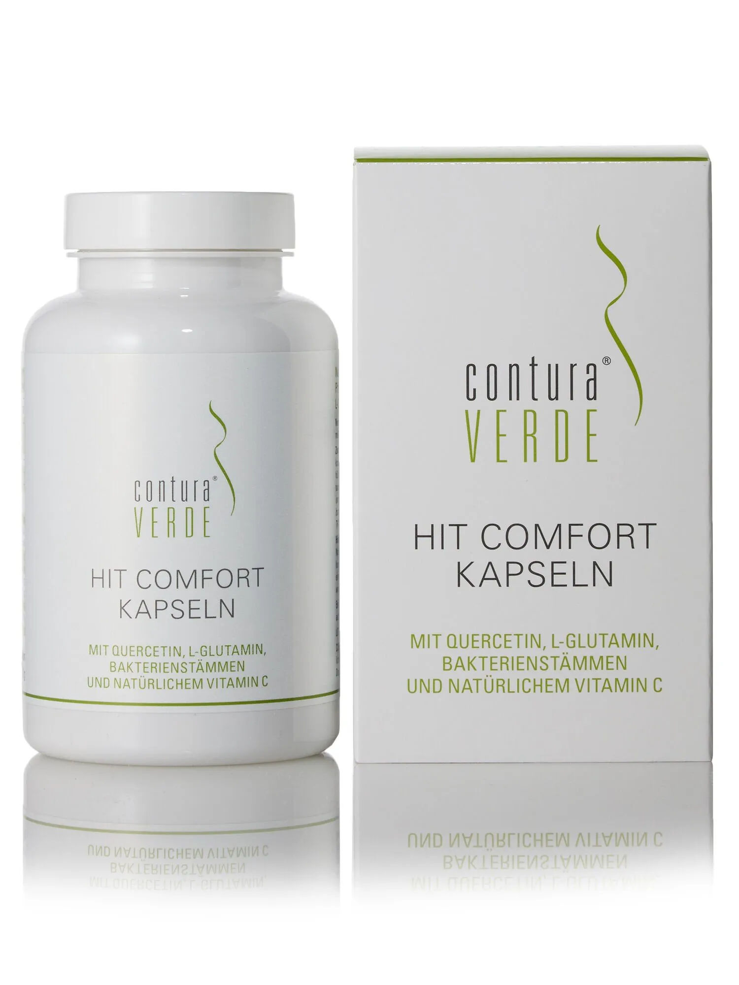 Die HIT COMFORT KAPSELN bestehen aus einem kraftvollen Komplex aus hochwertigem Quercetin, einer sorgfältig ausgewählten Bakterienkulturen Mischung und L-Glutamin aus pflanzlicher Fermentation, abgerundet durch wertvolles Vitamin C aus der Acerola Frucht.