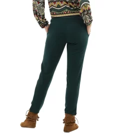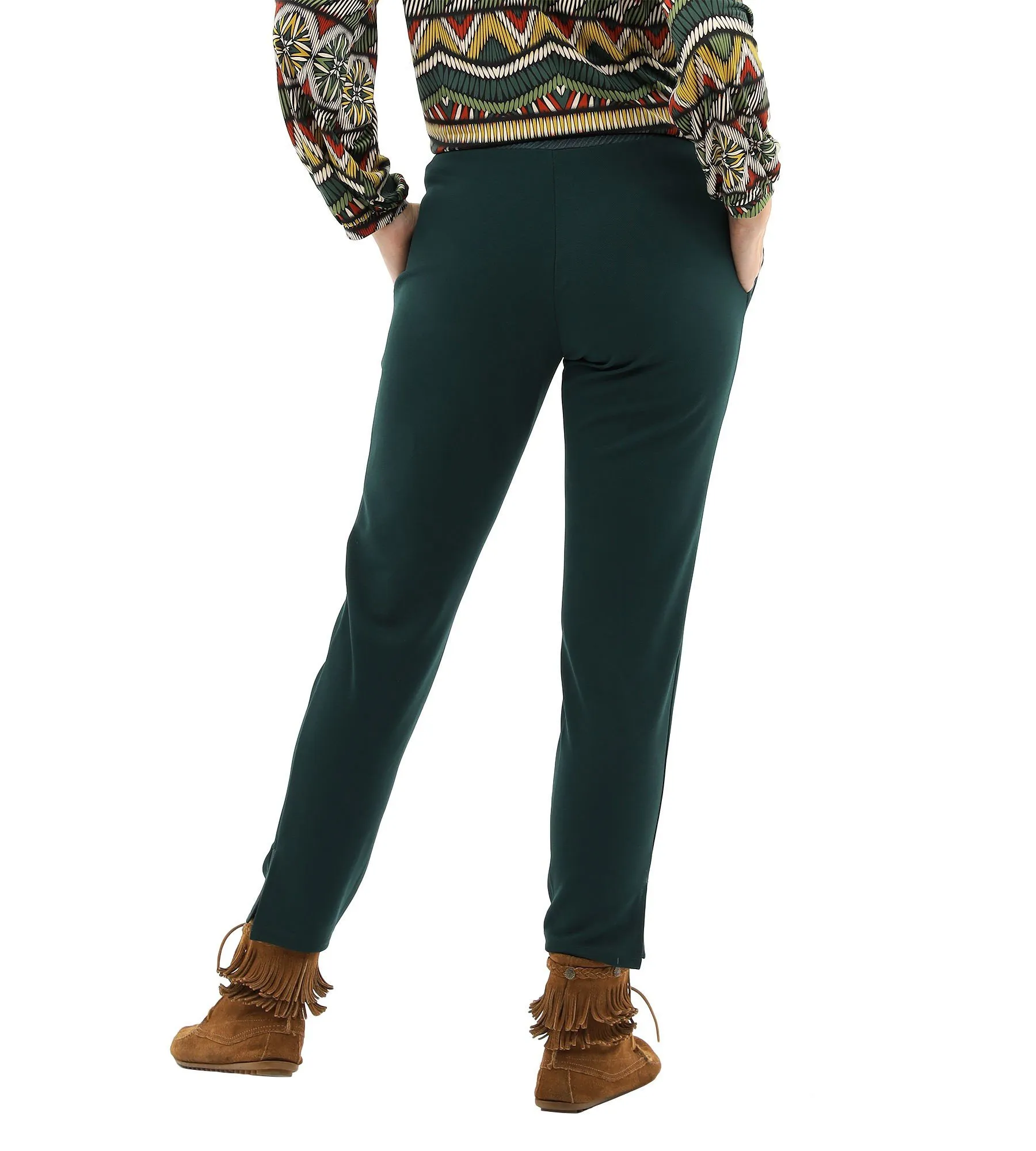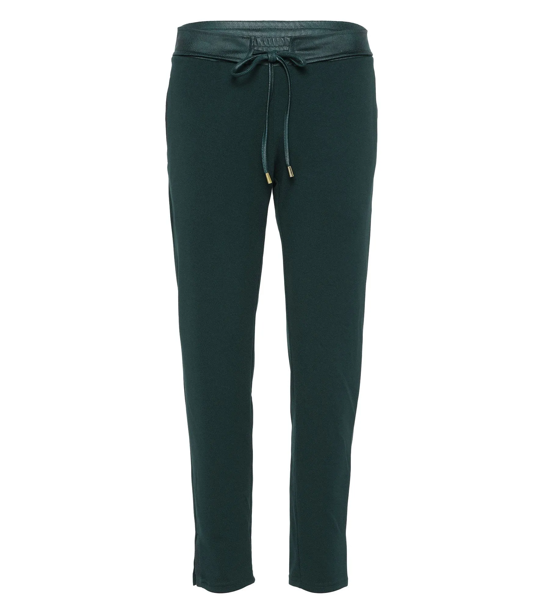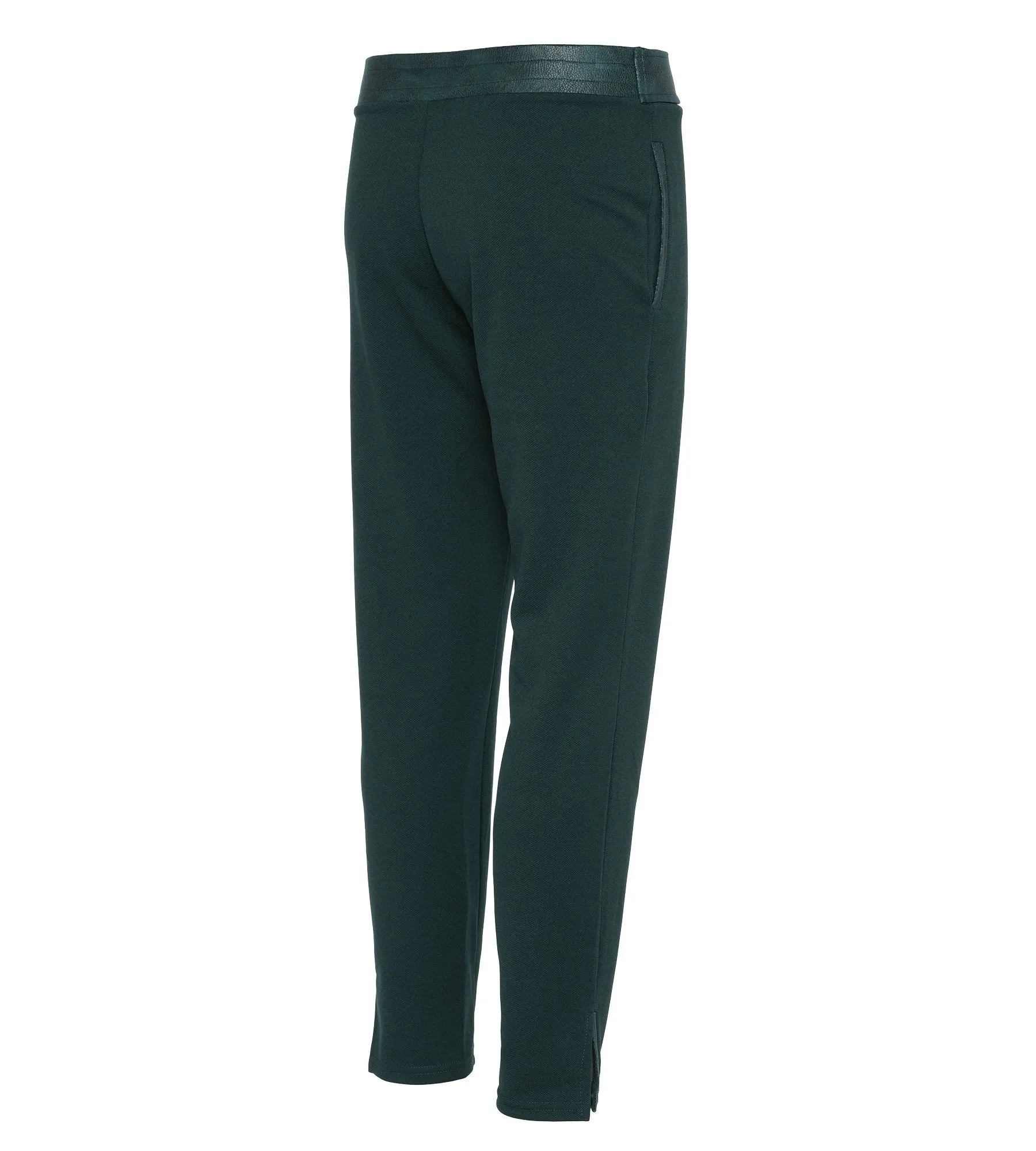 - Hosenbein am Saum mit Schlitz und ebenfalls mit Paspel in Lederoptik