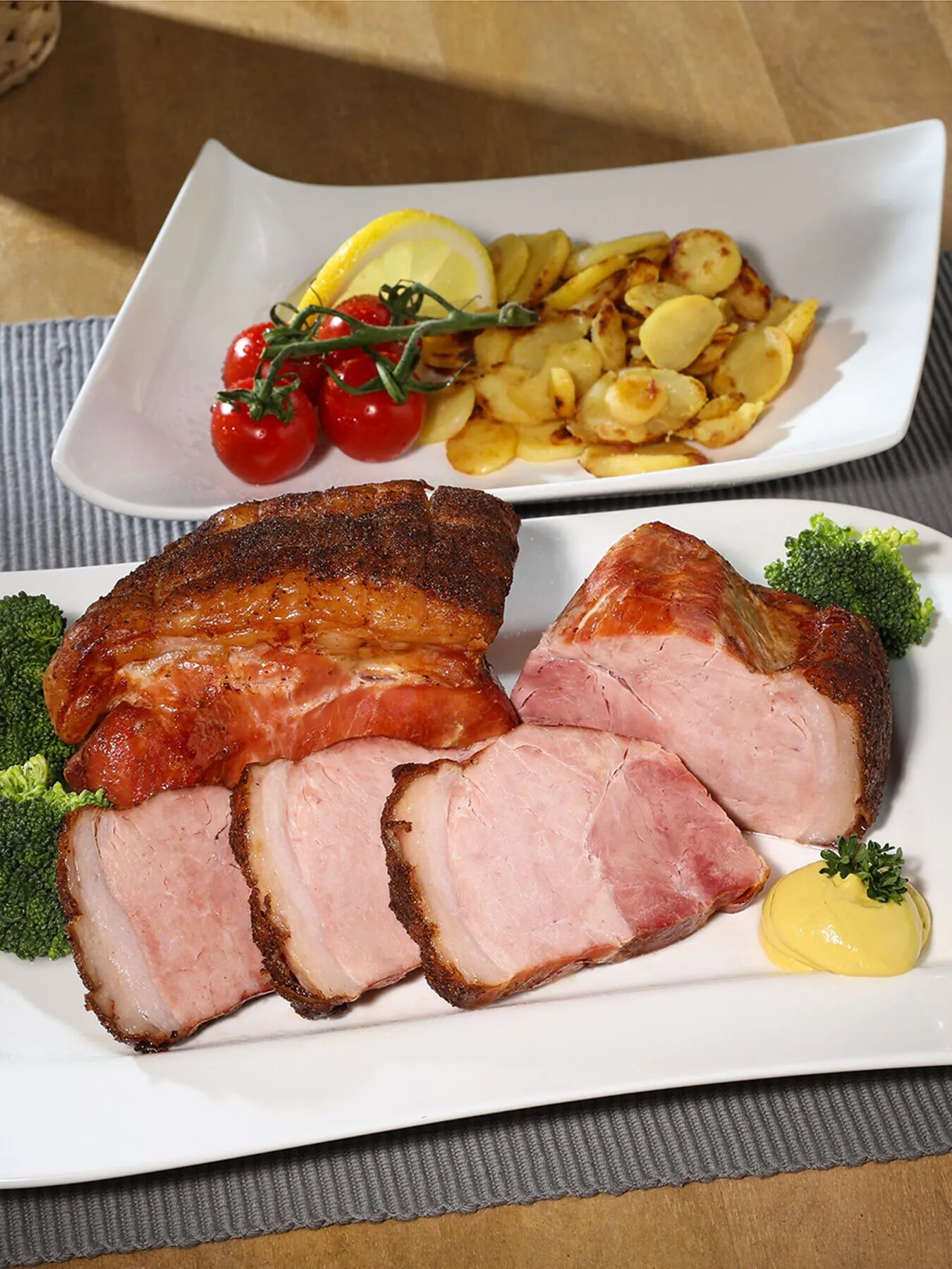 Der genüssliche Schinken aus dem mageren & zarten Schweinerücken wird Ihnen auf der Zunge zergehen. Durch den ca. 1 cm dicken Fett-Rand, der die herrliche gelbbraun-goldene Kruste bildet, wird das Fleisch traumhaft saftig. Mit einer leichten Pfeffernote auf der Speckkruste rundet der Stefanshof gekonnt das leckere Mahl ab.