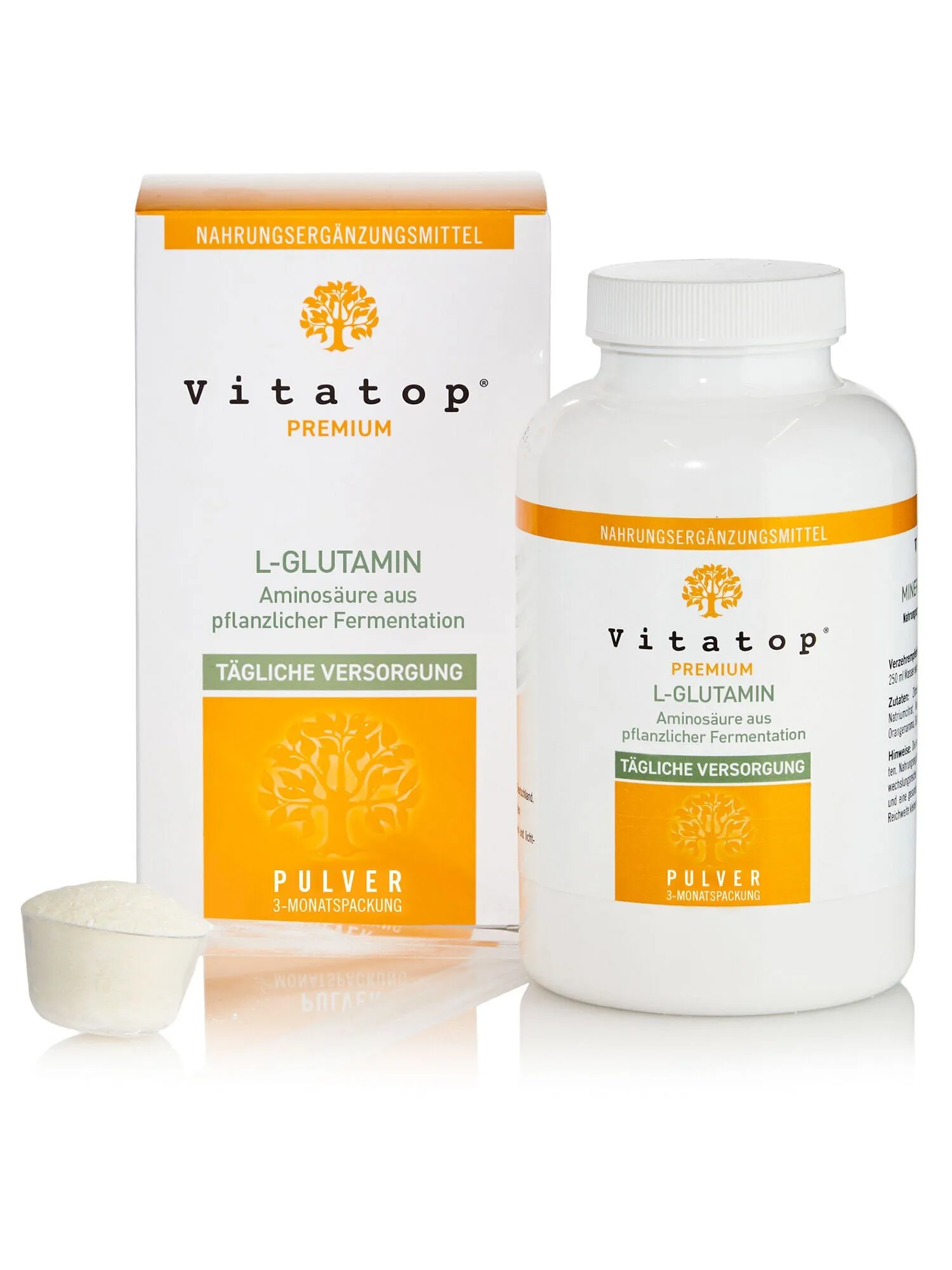 VitatopÂź L-GLUTAMIN ist ein hochwertiges NahrungsergĂ€nzungsmittel mit wertvollem, natĂŒrlichem L-Glutamin, das aufwendig durch pflanzliche Fermentation gewonnen wird.