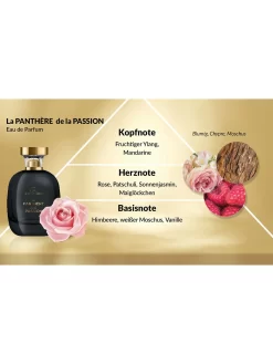 La PANTHÈRE de la PASSION von Christian Materne zeichnet sich durch sinnlich elegante Duftakkorde aus, die Frauen auf Anhieb überzeugen. Der verführerische Duft zieht ebenso das andere Geschlecht in seinen Bann. Das Eau de Parfum kommt in einem luxuriösen Flakon, welcher edel in Schwarz und Gold gestaltet ist. Der facettenreiche Duft nutzt viele fruchtige Akkorde, die mit einigen floralen Akzenten kombiniert werden. Abgerundet mit natürlichen und weichen Akkorden, welche durch Moschus, Vanille und Himbeere hervorgerufen werden.