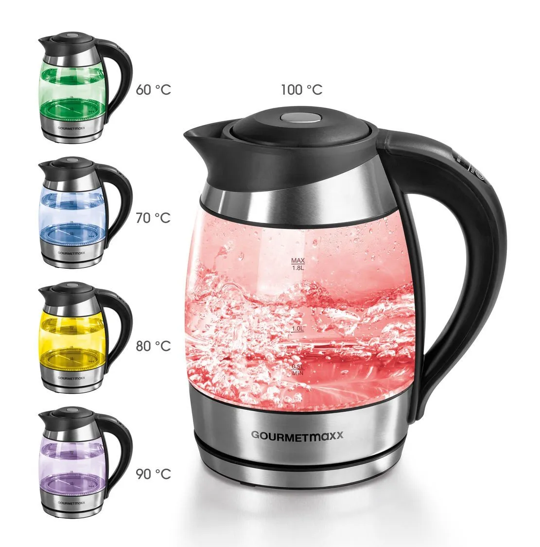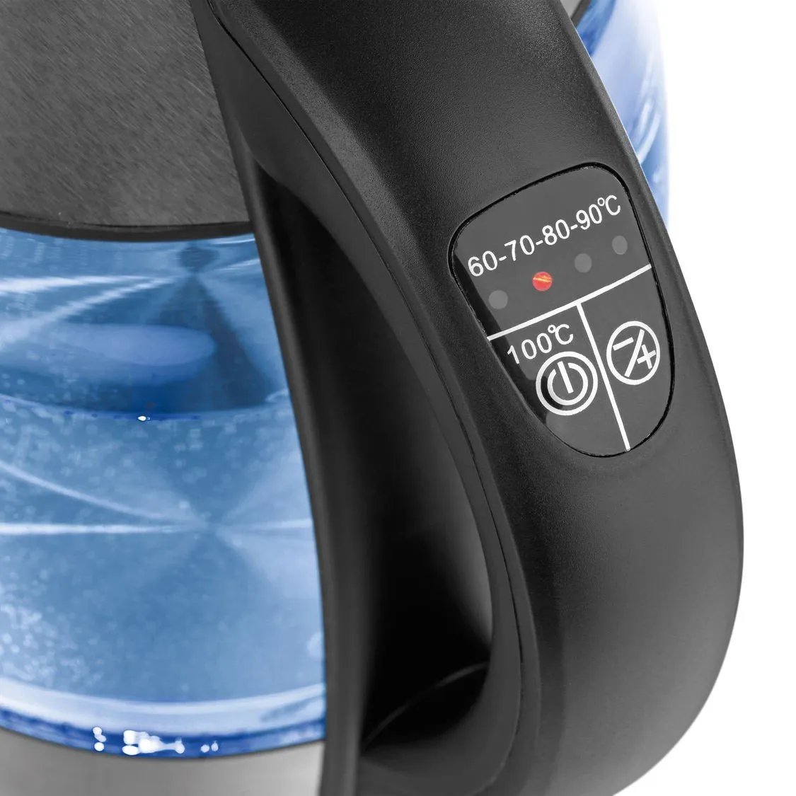 Der Glas-Wasserkocher besticht mit seinem modernen Design und einer cleveren LED-Farbcodierung. Wählen Sie aus fünf Temperaturstufen von 60° C bis 100° C die optimale für Ihren Bedarf aus. Der LED-Farbwechsel zeigt Ihnen die gewählte Temperaturstufe an: Jede Stufe hat eine andere Farbe. Durch das punktgenaue Erhitzen haben Sie immer das “passende Wasser“ für Tee, Fertigsuppen und Co. zur Hand und sparen ganz nebenbei Energie. Mit Abschaltautomatik und Trockenkochschutz für Ihre Sicherheit. 360° drehbare Basisstation für kabellosen Bedienkomfort.