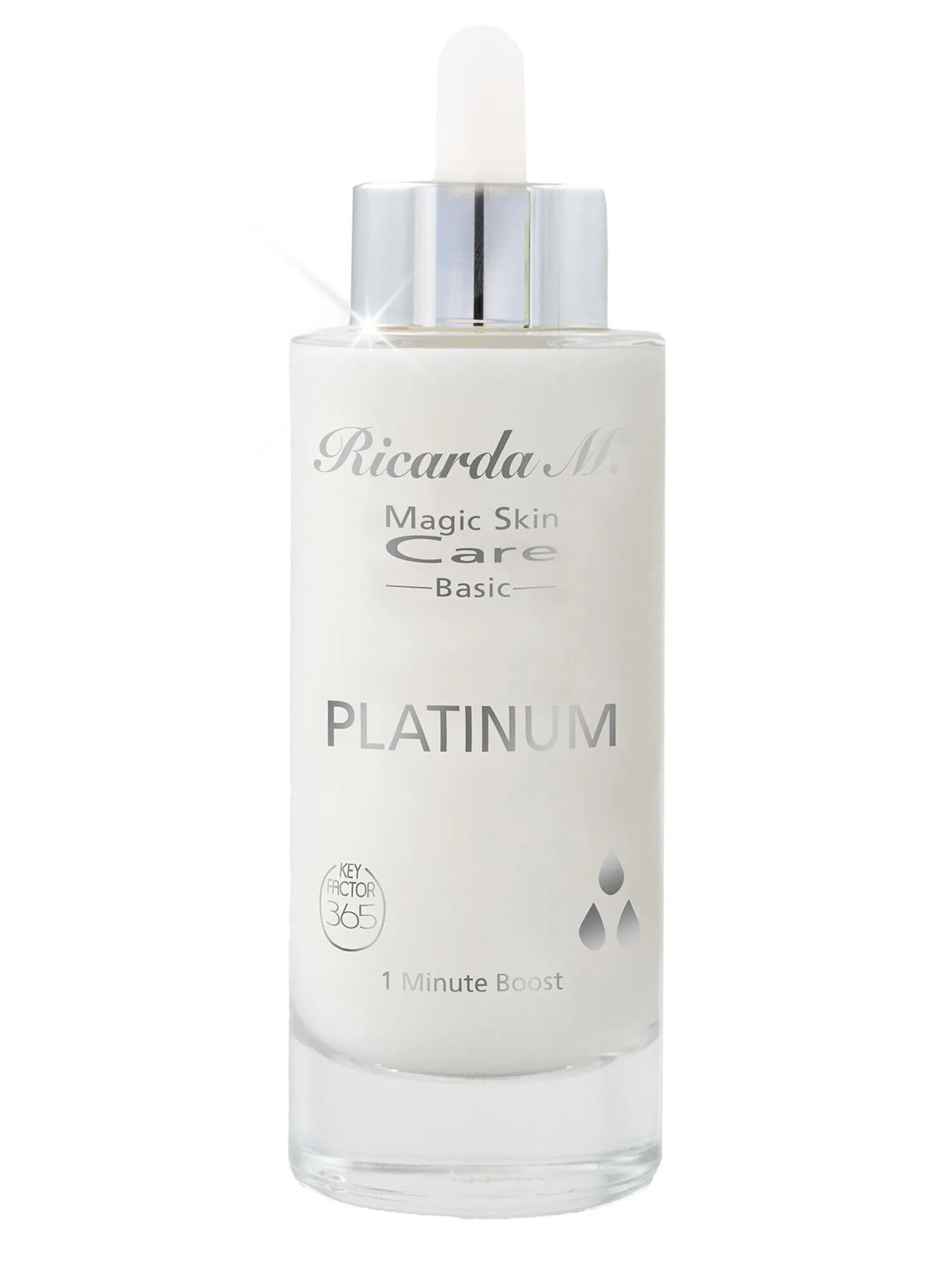 Die Luxusversion des 1 Minute Boosts mit 1-Minute Effekt von Ricarda M., angereichert mit edlem Platinum. Nach bereits 15 Minuten reduziert sich die Faltentiefe um 39,67 %, nach 30 Minuten um 50,44 %. Platinpeptide pushen die Funktion des Bindegewebes. Die Synthese von Kollagen wird dadurch enorm gesteigert (Kollagen I um bis zu 280%, Kollagen III um bis zu 250 %). Die Platinpeptide regen die ATP-Synthese an, die dadurch resultierende verbesserte Zellaktivität und Zellatmung stellt den Zellen mehr Energie zur Verfügung, um Verbindungskollagen zu synthetisieren. Das Verbindungskollagen verbessert die Hautbeschaffenheit und sorgt für eine optimale Feuchtigkeitsversorgung der Haut. Tiefere Hautschichten werden aktiviert und genährt. Ein siebenfacher Hyaluron- Komplex sorgt für einen natürlichen Hyaluron-Aufbau mit Depot-Auffüllung und Retard-Effekt zur Aktivierung hauteigener Hyaluronsäure mit sofortigem Glätte- Effekt. Biopolymere von Lärchen reduzieren den transepidermalen Wasserverlust. Intensive straffende Powerwirkstoffe und Moringaöl schenken der Haut ein frisches und natürlich verfeinertes Hautbild. Ein herausragender „Super-Boost“ für eine schnelle und effektive Auffrischung von Teint und Ausstrahlung, gekoppelt mit optimaler Versorgung für die Haut zum Ziel der optischen Verjüngung.