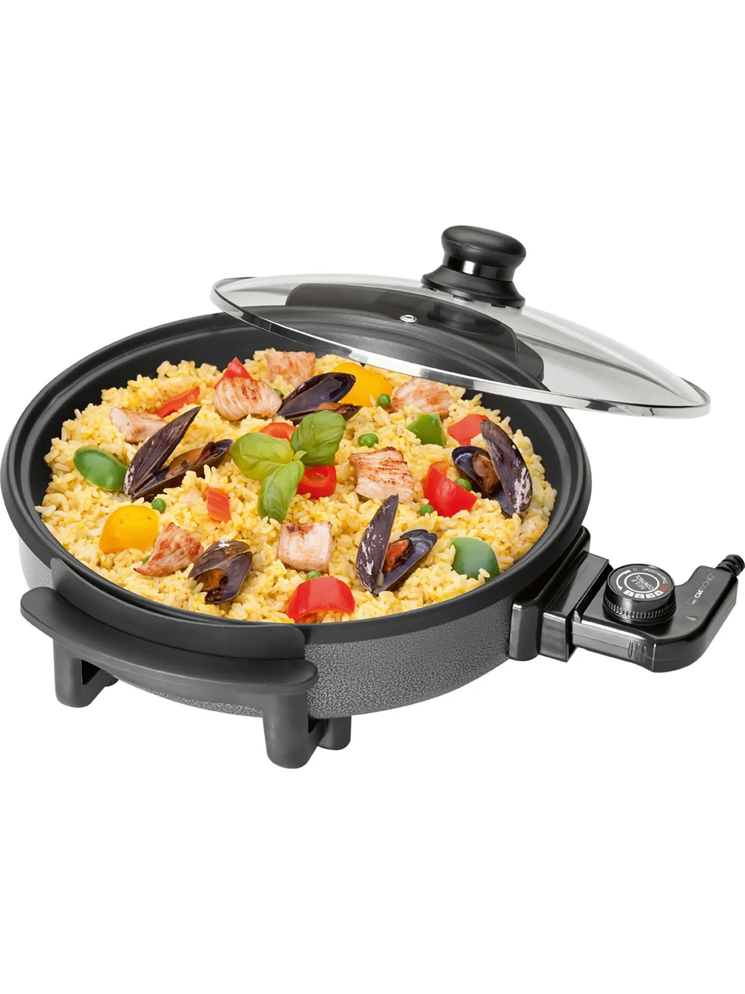 Genießen Sie die Freiheit, die Gerichte ganz nach Ihren Bedürfnissen zuzubereiten, dank des stufenlos regelbaren Thermostats. Der hitzebeständige Glasdeckel mit Griff ermöglicht es Ihnen, den Garvorgang jederzeit im Auge zu behalten, während die wärmeisolierten Handgriffe Ihnen einen sicheren Halt bieten. Die ca. 3,5 cm tiefe Pfanne mit einem großzügigen Durchmesser von 32 cm ist mit einer hochwertigen Antihaftbeschichtung versehen, die eine mühelose Reinigung ermöglicht.