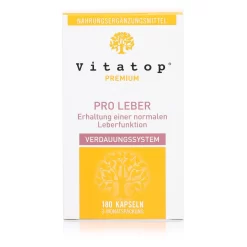 Vitatop® PRO LEBER ist ein hochwertiges Nahrungsergänzungsmittel, das aus einer speziell auf die Leberfunktionen abgestimmten Nährstoffkombination besteht. Die Kapseln enthalten wertvolle Pflanzenextrakte aus Artischocke, Mariendistelsamen, Löwenzahnwurzel, Goldrutenkraut und Wermut, die Aminosäuren Glycin, L-Cystin, L-Glutathion, Vitamin B6 und Folsäure. Zudem enthalten sie Cholin zur Unterstützung einer normalen Leberfunktion.