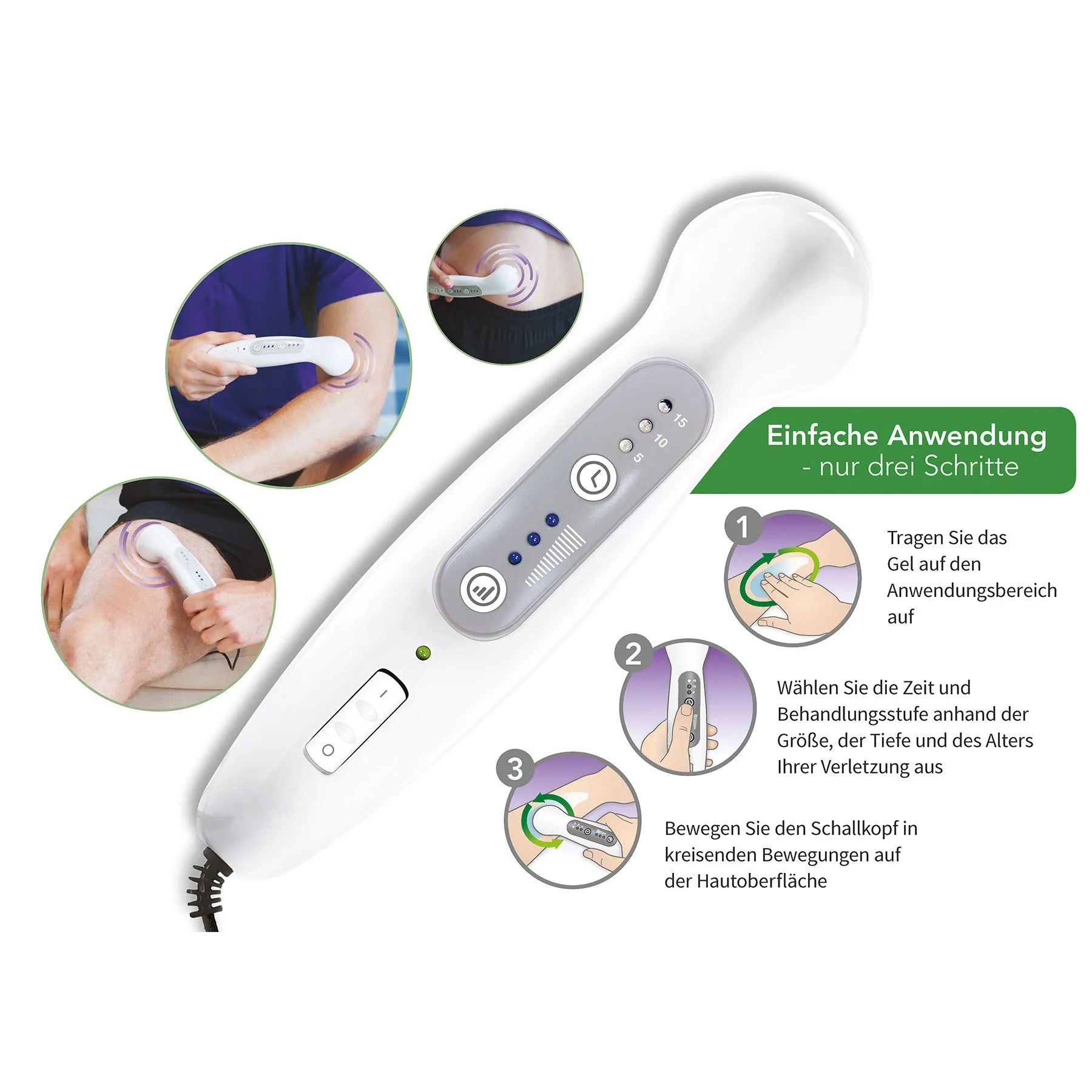 Schmerzende Gelenke und Muskeln können die Lebensqualität maßgeblich beeinträchtigen. Höchste Zeit, etwas dagegen zu tun! Mit unserem effektiven Ultraschalltherapiegerät können die Schmerzen ohne Arzneimittel gelindert und der Heilungsprozess beschleunigt werden. Der Ultraschall gelangt dabei bis zu 4,0 cm tief an die beschädigten Bereiche und kann dort seine volle Wirkung entfalten. Die Zellen werden dadurch stimuliert und können mehr Proteine, Mineralstoffe und Spurenelemente aufnehmen. Diese besondere Technik kann zu einer Beschleunigung der Zellreparatur sowie einer schnelleren Schmerzlinderung und Ausheilung führen.