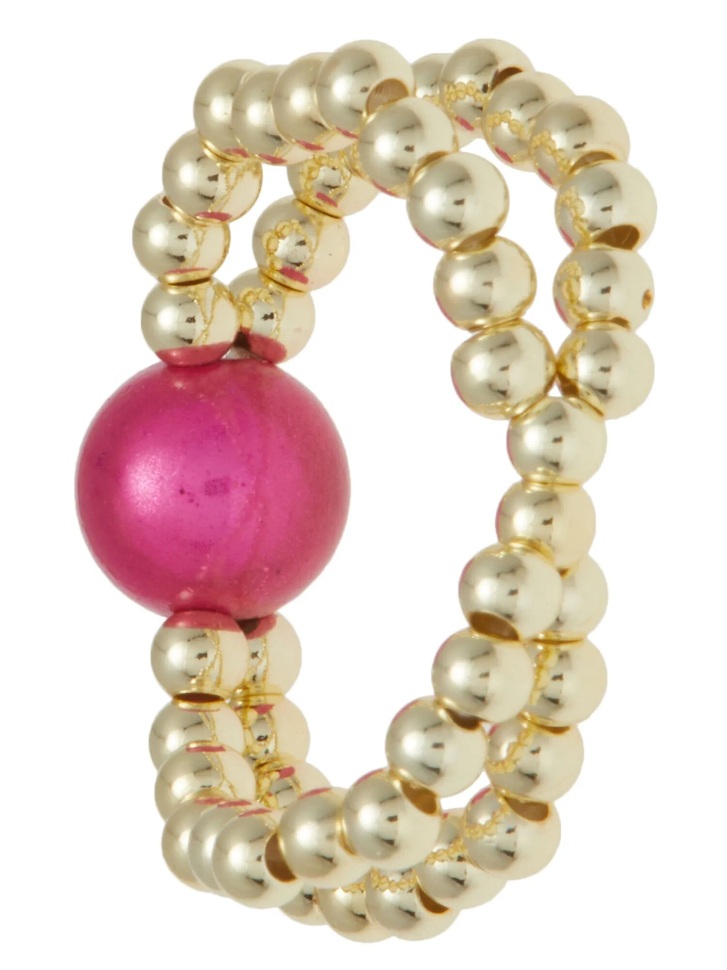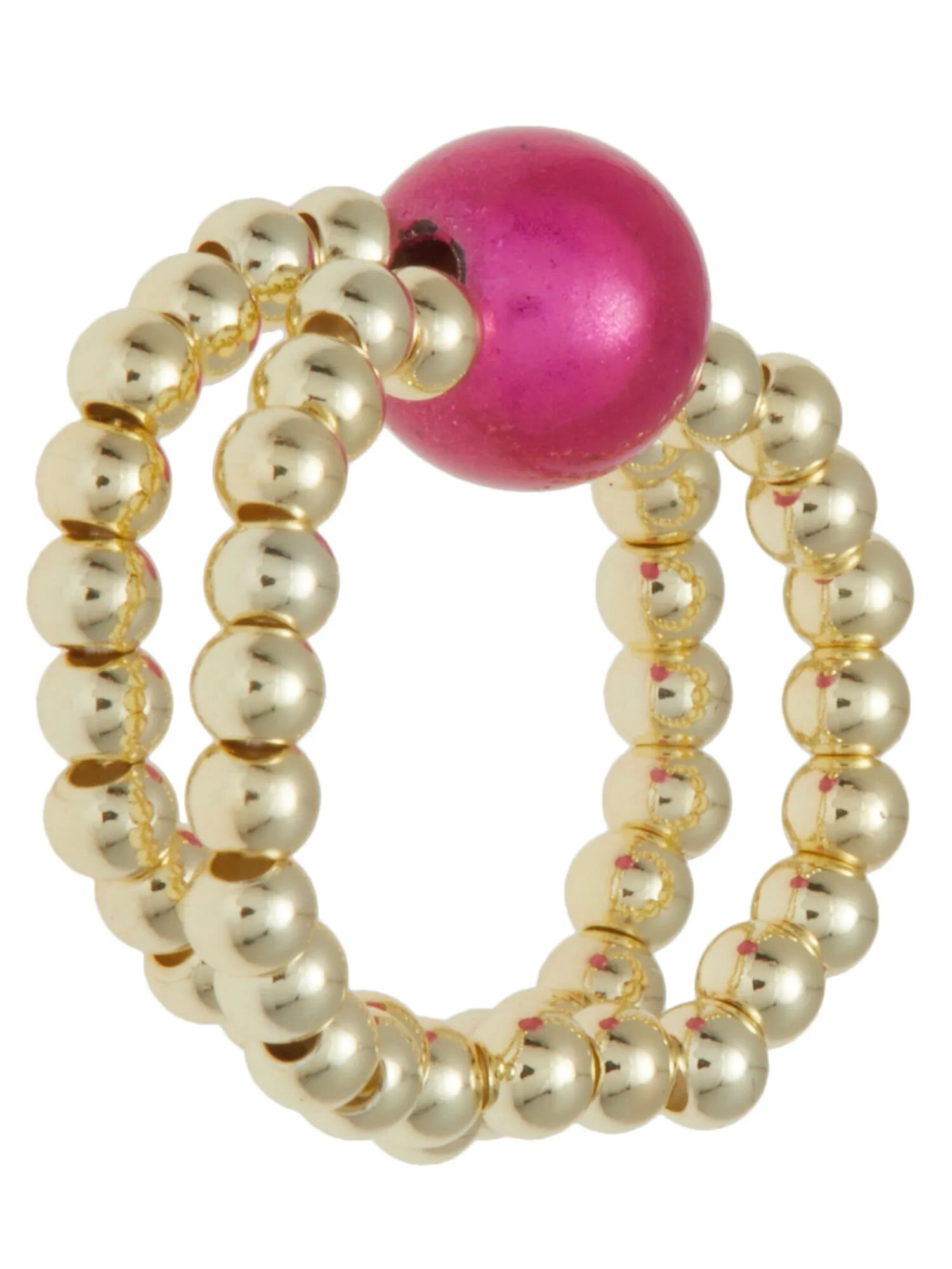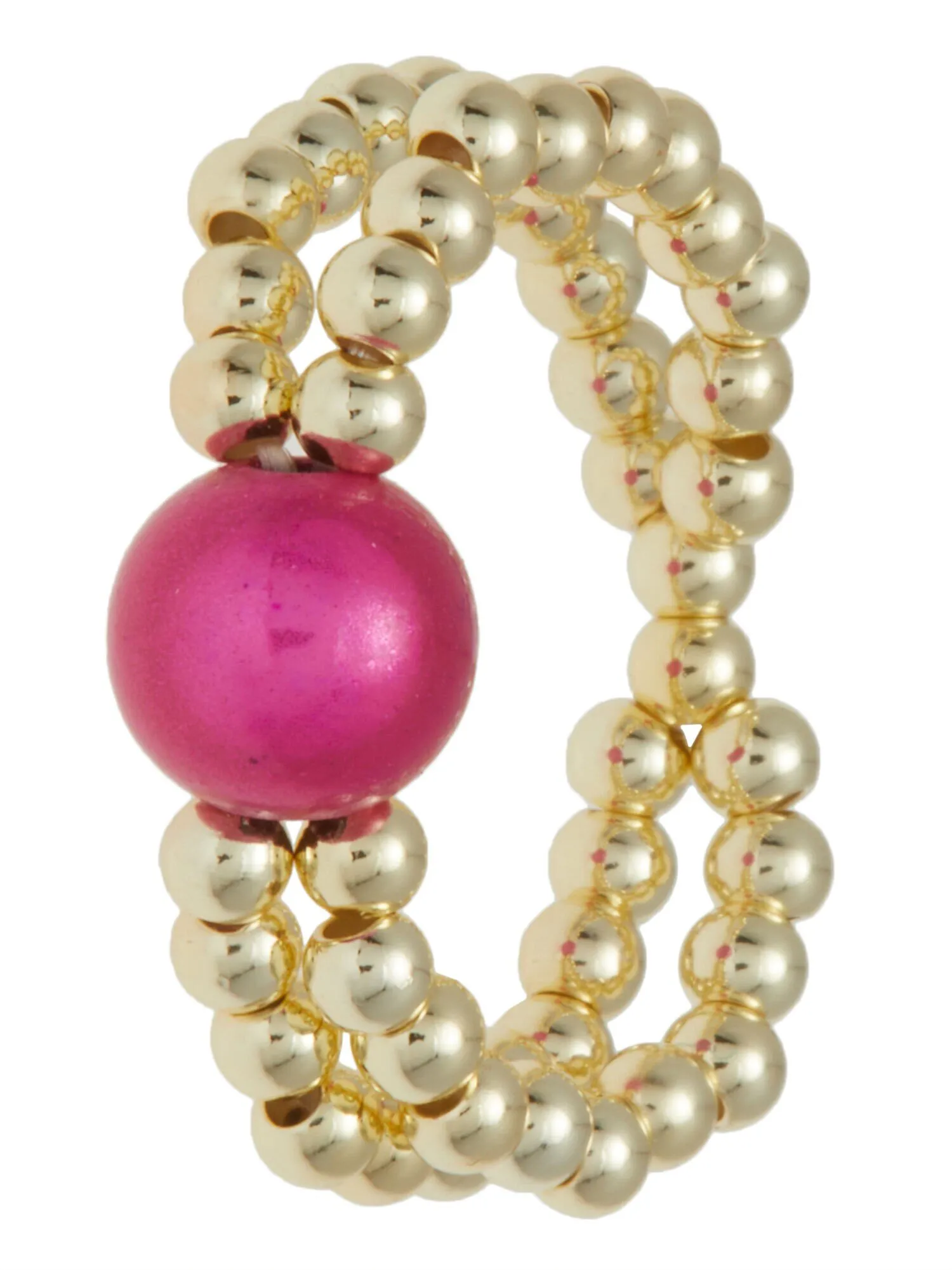 Die Hauptperle leuchtet in lebendigem Pink oder erfrischendem TĂŒrkis und bildet das strahlende Zentrum dieses Ringes. Umgeben von einer Anordnung vergoldeter oder rhodinierter Perlen, welche die Schönheit der Hauptperle hervorheben, entsteht eine harmonische Kombination aus Farbe und Glanz. Die Ringschiene, auf elastischem Band gefĂ€delt, ĂŒberschneidet sich geschickt, um eine fesselnde Struktur zu formen, die sich an den Finger schmiegt und Bewegung und FlexibilitĂ€t verleiht.Â