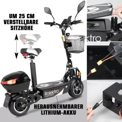 Starke Ausstattung: Der sportliche E-Scooter wird voll ausgestattet geliefert – mit Korb, Koffer, Handyhalterung, USB-Ladebuchse, Schlüsselsatz, Akku-Box, Ladegerät und farbigen deutschen Handbuch!
