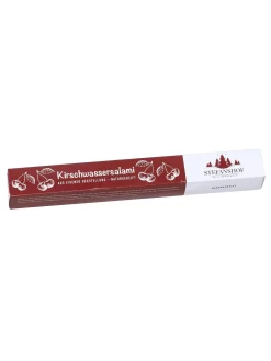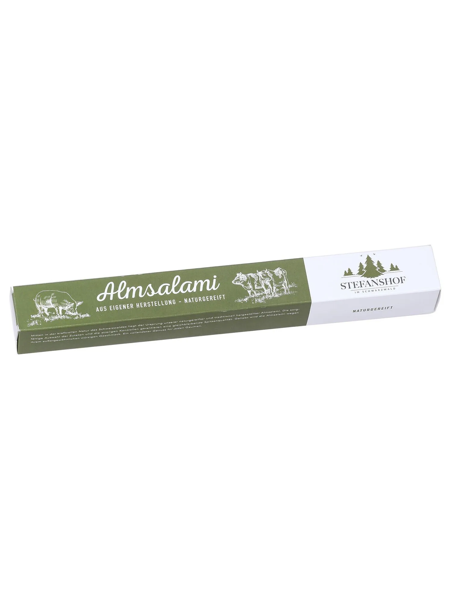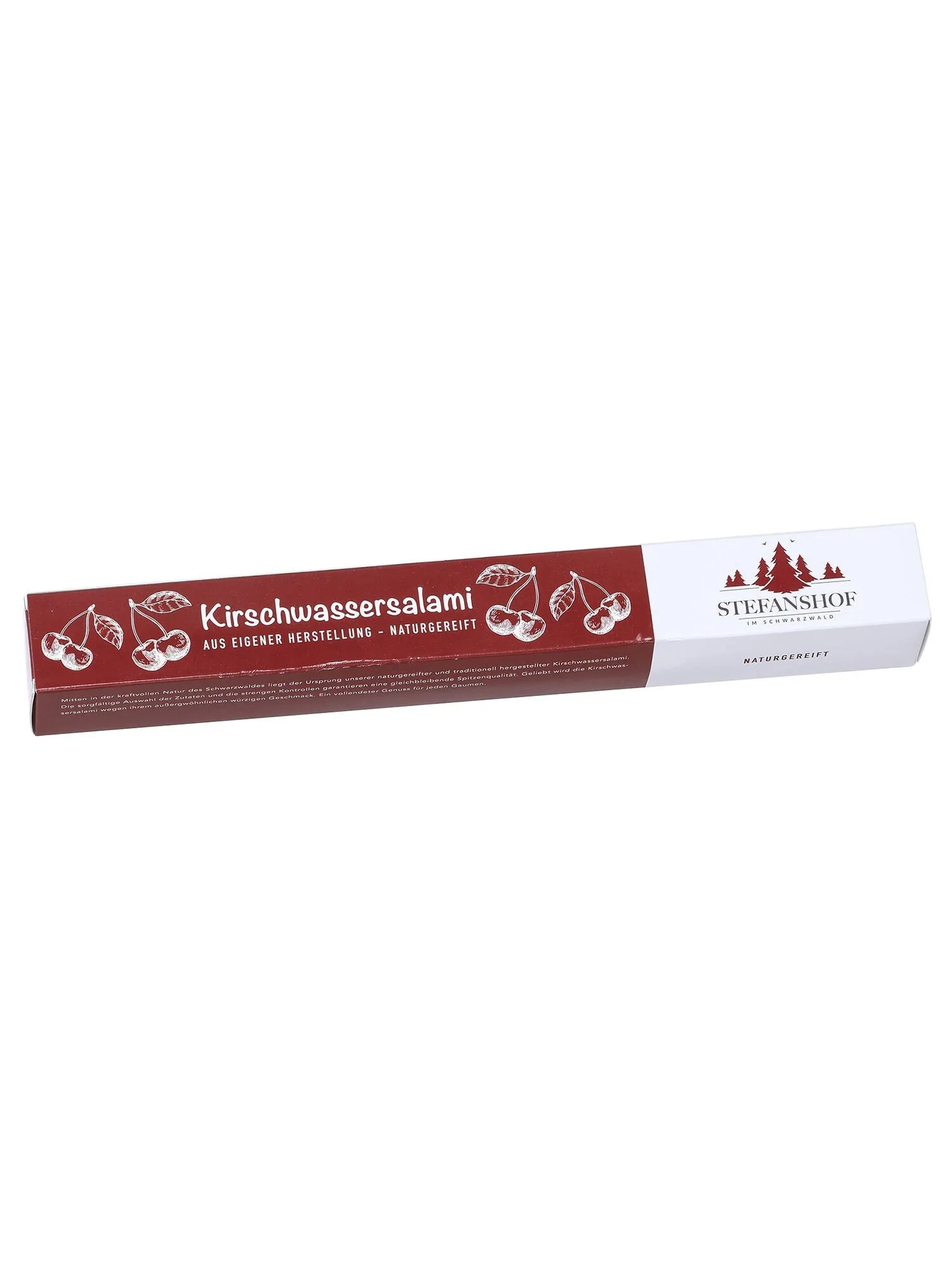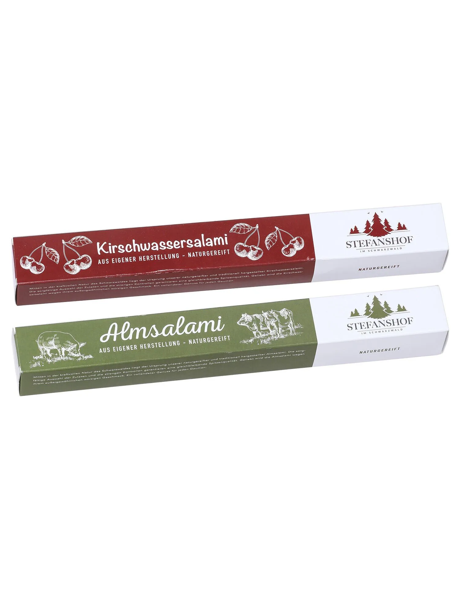 Dieses Salami-Geschenkset ist nicht umsonst eine echte Spezialität aus dem Hause Stefanshof! Die Kirschwassersalami mit edelstem Kirschwasser verfeinert und über Tannenholz leicht geräuchert, ist ein echter Leckerbissen. Durch das original Schwarzwälder Kirschwasser, welches über ein zartblumiges Aroma verfügt, wird der tolle Geschmack der feinen Salami abgerundet. Die leckere herzhafte Salami passt durch die leicht blumige Note hervorragend zu allen Rezepten wie z. B. Tagliatelle Salat mit Pinienkernen, Parmesan und Rucola. Zu empfehlen beispielsweise für einen Grillabend ist ebenfalls ein Reissalat mit Paprika und unserer aromatischen Salami perfekt oder zu einem tollen Vespermahl. Die vollmundige Almsalami reiht sich in Ihrer ausgezeichneten Qualität sowie Geschmack hervorragend ein. Zum Vesper und auch in Soßen können Sie eine pikante Vielfältigkeit daraus zaubern. Durch die hochwertige Geschenkverpackung eignen sich beide hervorragend als liebevolles Präsent zu Festlichkeiten.