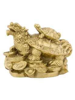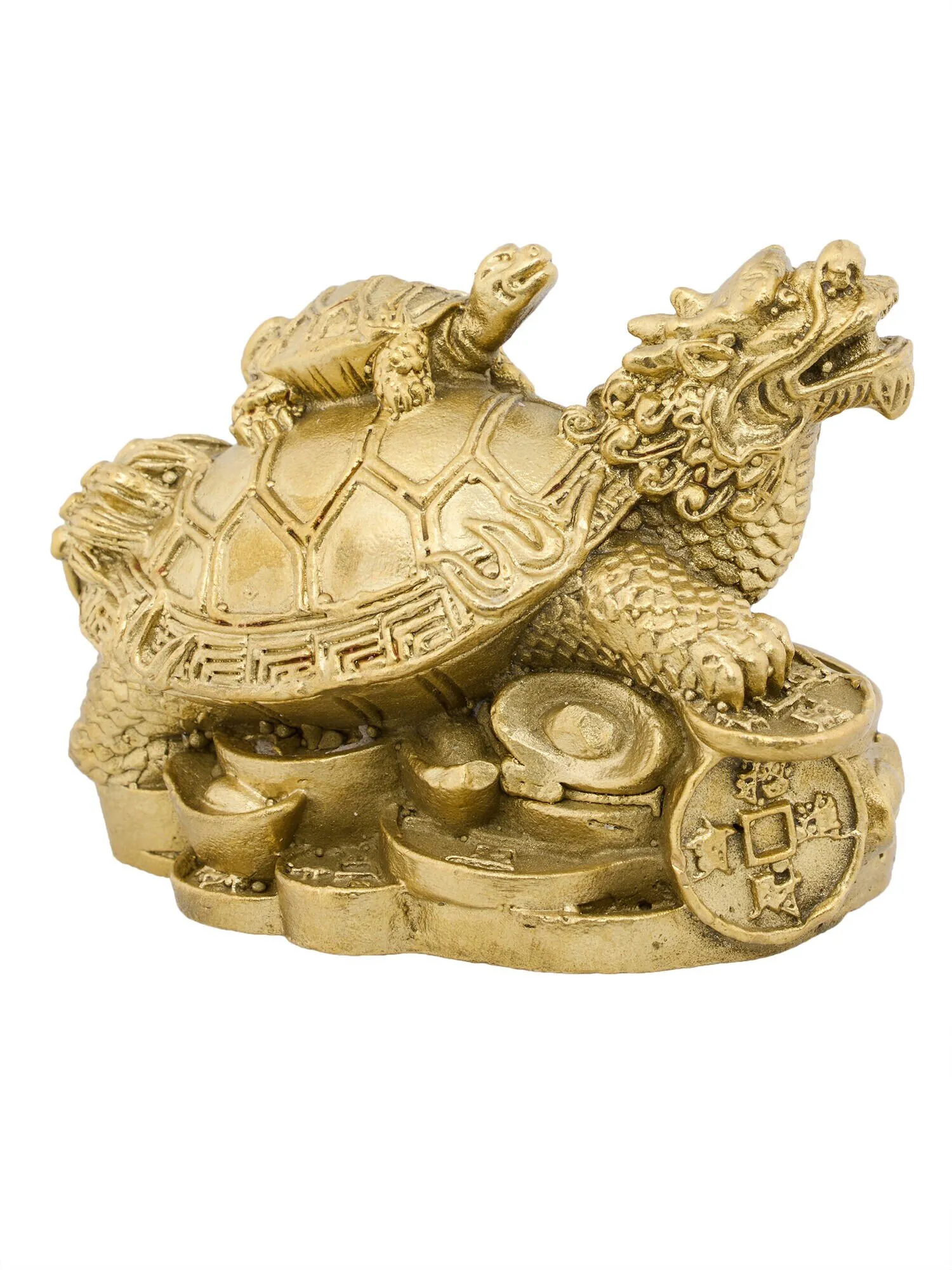 Diese goldene Statue prĂ€sentiert eine majestĂ€tische Schildkröte mit einem Drachenkopf, die auf einem Bett aus ReichtumsmĂŒnzen und Goldbarren thront. Auf ihrem RĂŒcken sitzt eine kleine Schildkröte, die das Bild der Langlebigkeit und des Schutzes verstĂ€rkt. Diese kunstvoll gestaltete Skulptur verkörpert die Werte von StĂ€rke und Ausdauer, die mit den Schildkröten assoziiert werden.