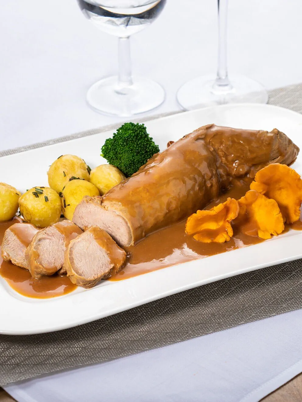 Das Stefanshof Schweinefilet in Pfifferlingsoße ist ein absolutes Highlight aus der Schwarzwaldküche. Freuen Sie sich auf ein ganzes super zartes und aromatisches Schweinefilet, über Stunden im Niedergarverfahren schonend hergestellt, zusammen mit einer Rahmsoße mit frischen Pfifferlingen. So schmeckt der Schwarzwald!