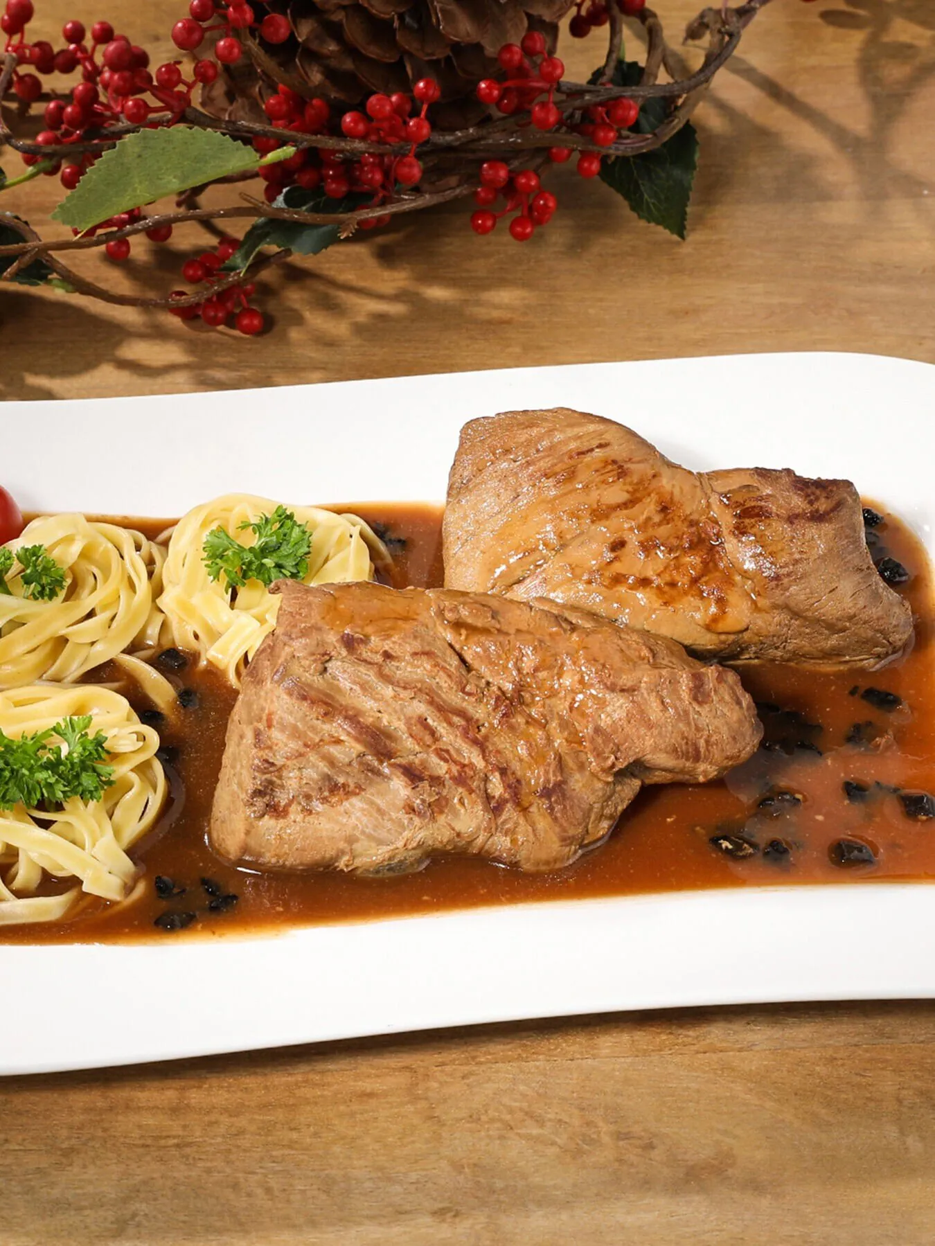 Das Schweinefilet in Trüffelsoße ist ein absolutes Highlight aus der Schwarzwaldküche vom Stefanshof. Ein ganzes, super zartes und aromatisches Schweinefilet über Stunden im Niedergarverfahren schonend hergestellt, wird die Soße mit frisch geernteten schwarzen Trüffeln zusammengefügt. So schmeckt der Schwarzwald! Wenn dann noch die verführerischen Trüffel auf Bandnudeln oder auch Reis antrifft, entsteht ein nobles Festessen für den besonderen Anlass. Ein exquisites Essen wie im Restaurant! Das besonders intensive Aroma der Trüffel wird ein zusammenkommen mit Freunden oder Familie in ein echtes delikates Essen verwandeln und lässt jedes Genießer-Herz höherschlagen!