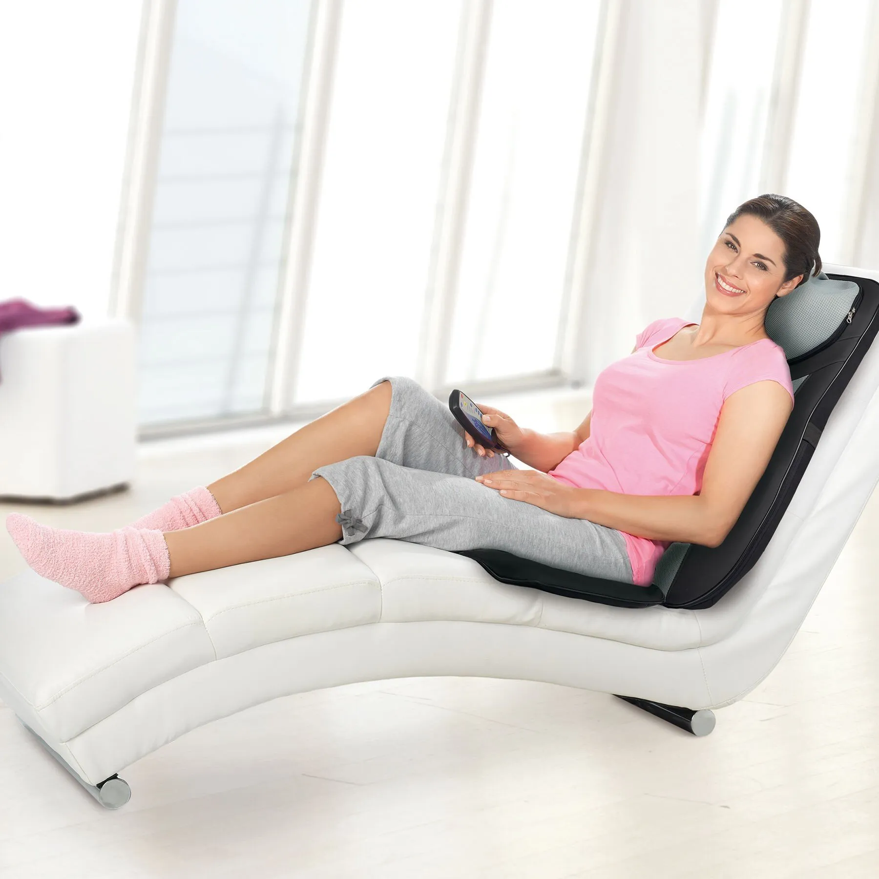 Die rotierenden und höhenverstellbaren Massageköpfe kneten auf Wunsch Ihren gesamten Rücken oder nur einen Teil davon. Zwischen 5 Massageprogrammen können Sie dabei wählen: Nacken, punktuelle Massage, oberer Rücken, unterer Rücken und ganzer Rücken. Ihre wohltuende Massage können Sie zusätzlich durch Vibration oder Wärme bequem über die Kabelfernbedienung ergänzen und so Ihre Behaglichkeit noch steigern. Damit Ihr Verwöhnprogramm noch komfortabler wird, können Sie die Massagedauer über einen praktischen Timer steuern.