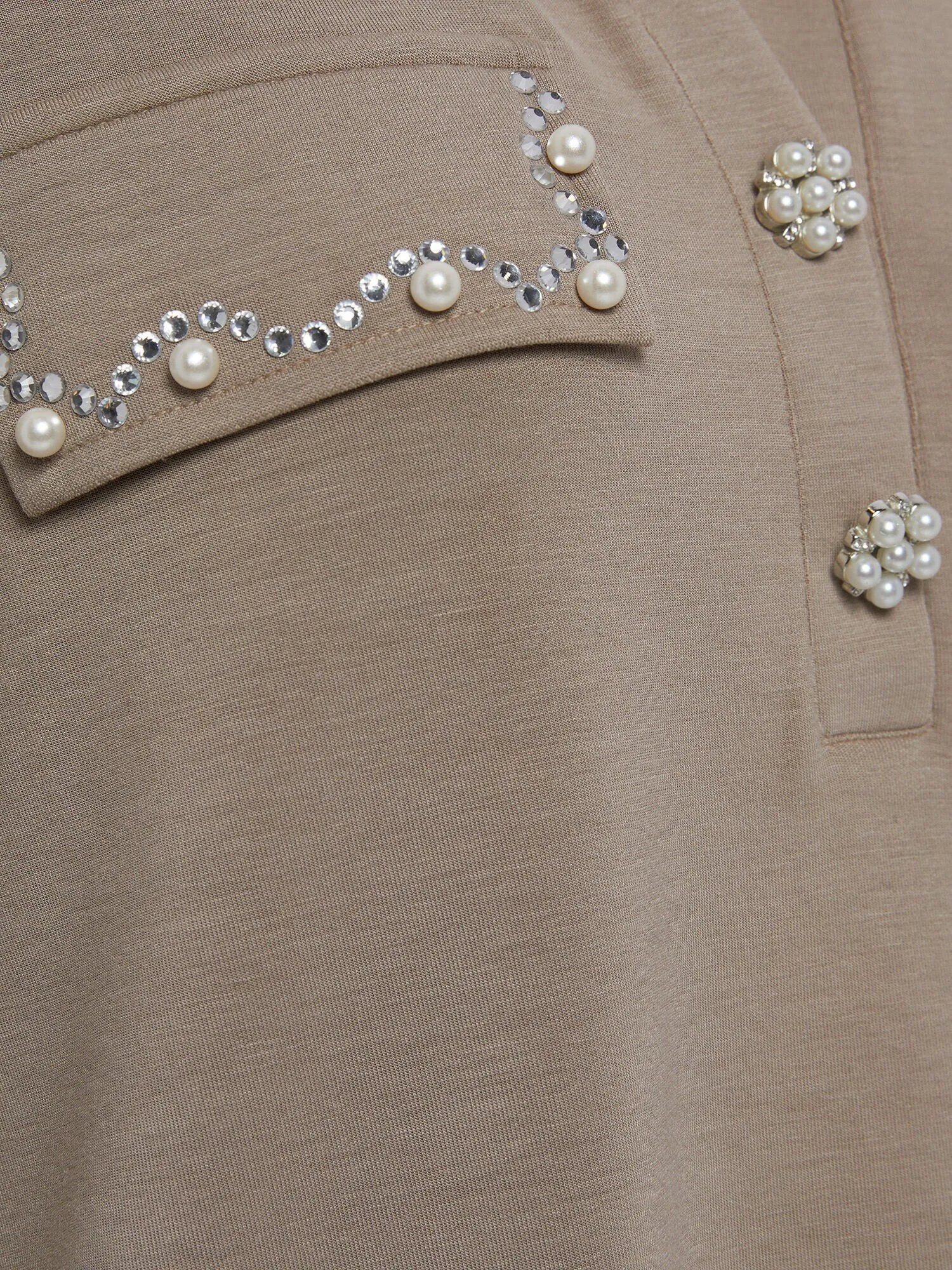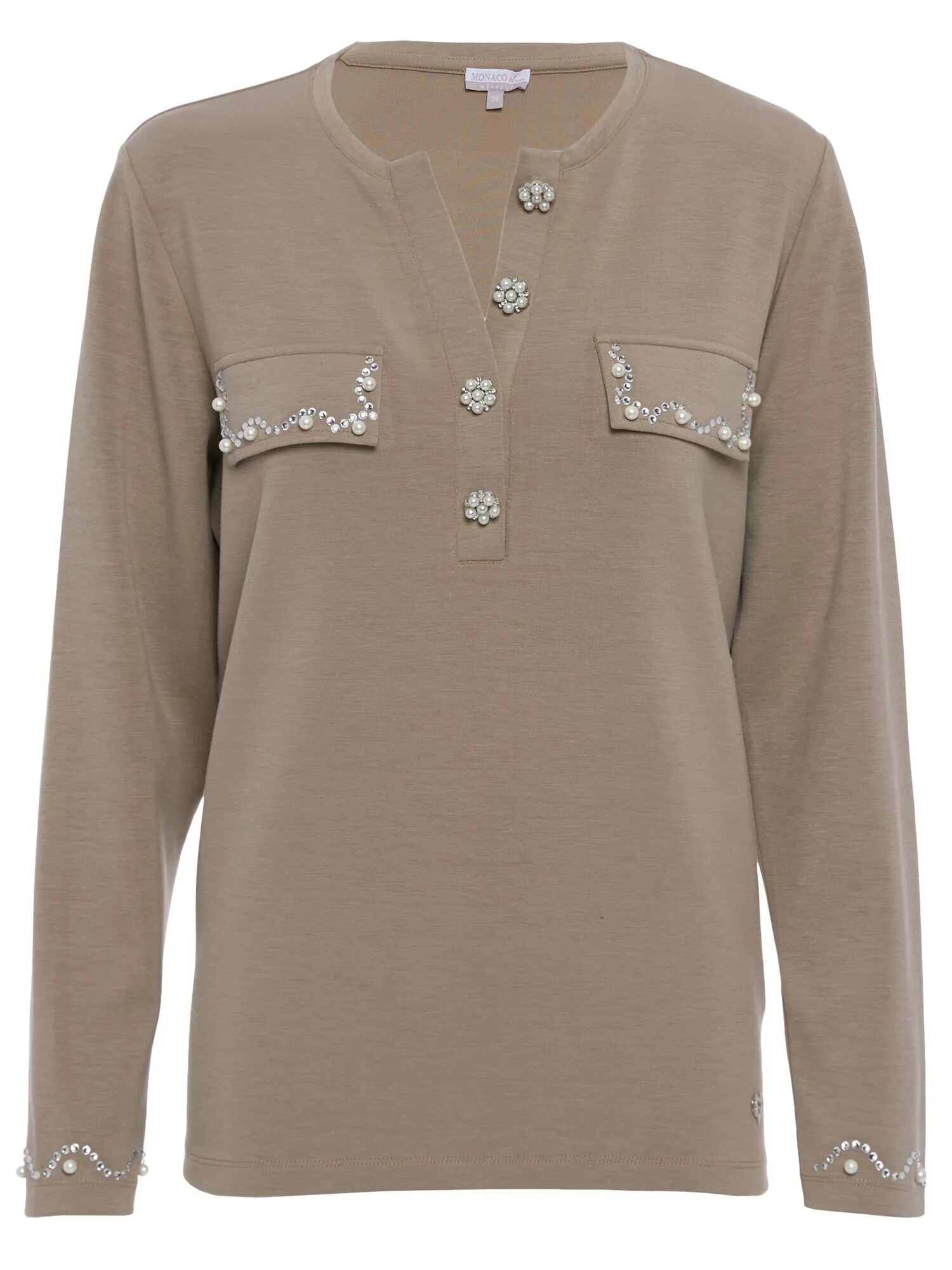Entdecken Sie das Silk Jersey Shirt Pearl in der eleganten Farbe Taupe. Hergestellt aus hochwertigem Modal, bietet dieses Shirt ein angenehm weiches Tragegefühl. Die aufgesetzten Brusttaschen verleihen dem Shirt einen raffinierten Touch, während die zarten Schmucksteine subtilen Glanz und Glamour verleihen. Perfekt für jeden Anlass, ob formell oder leger, dieses Shirt ist ein absolutes Must-Have für Ihren Kleiderschrank.