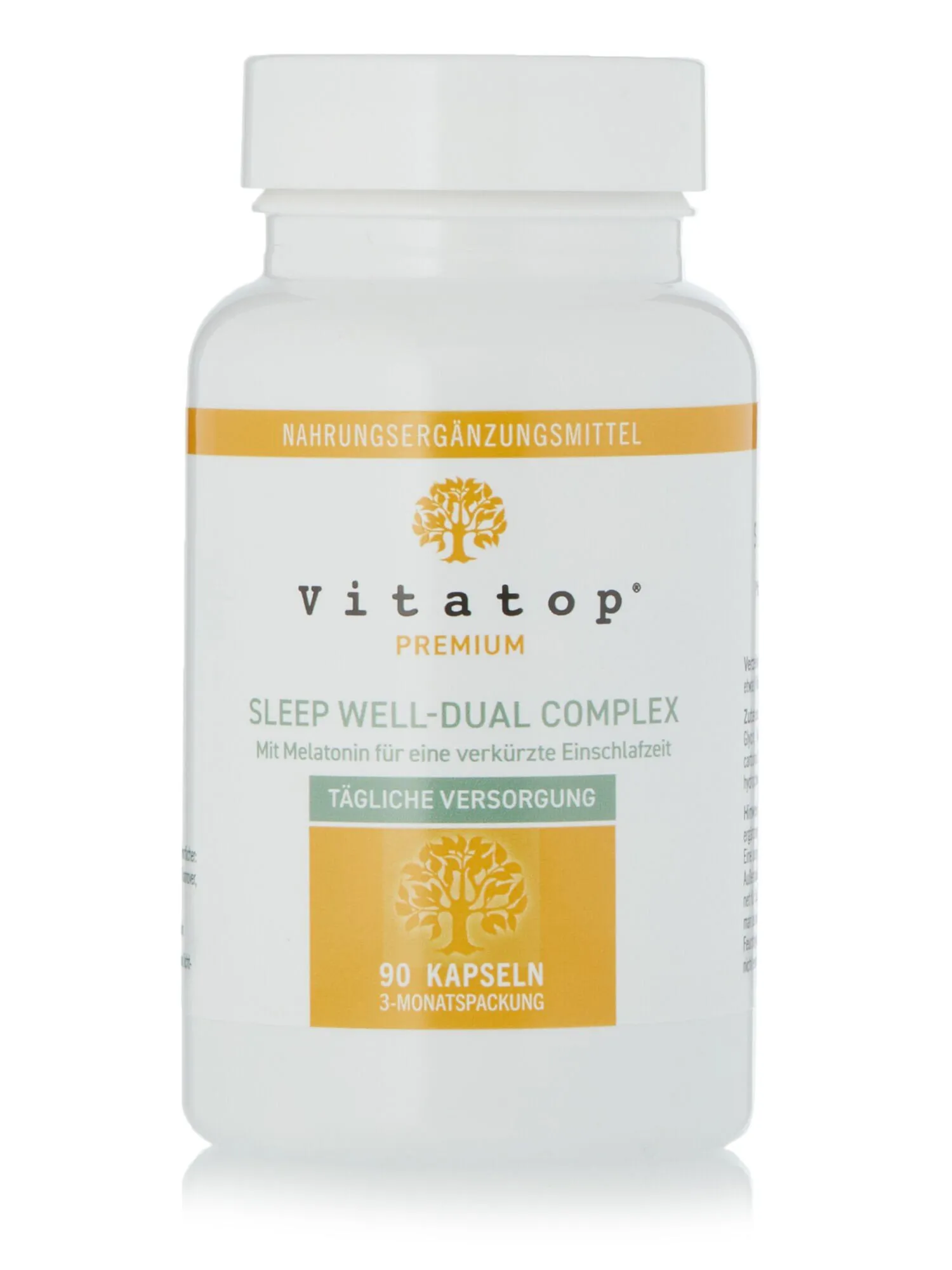 Vitatop® SLEEP WELL-DUAL COMPLEX ist ein hochwertiges Nahrungsergänzungsmittel, das mit speziellen Nährstoffen auf den Schlaf und das Nervensystem abgestimmt wurde. Die Kapseln enthalten Melatonin in Form des studiengeprüften Markenrohstoffs Melotime™. Melatonin trägt zur Verkürzung der Einschlafzeit bei. Zudem enthält es Magnesium und die Vitamine B1, B3 und B6 zur Unterstützung des Nervensystems. Abgerundet wird die Rezeptur durch wertvolle Extrakte aus Zitronenmelisse und Hopfen sowie die Aminosäuren Glycin und L-Tryptophan.