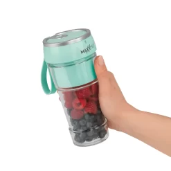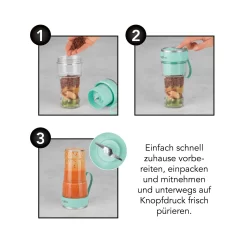 Mit dem Smoothie Maker to go können Sie Ihre Lieblingssmoothies oder Shakes ganz unkompliziert und in Ruhe daheim vorbereiten, mitnehmen und kurz vorher frisch pürieren. Einfach auf den Knopf im Deckel drücken – schon wird aus ganzen Beeren und geschnittenem Obst ein köstlicher Smoothie oder Shake. Optimal passend für Ihren Alltag – egal ob auf Ausflügen im Freien, auf dem Weg zur Arbeit oder nach dem Sport.