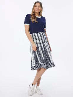 Der Strickrock „Maritim“ von Sarah Kern Designermode besticht durch sein edles Muster-Mix und die feine Viskose-Qualität. Das marine-weiße Design verleiht dem Rock eine maritime Note und macht ihn perfekt für den Sommer oder den Urlaub. Der weiche Stoff und der elegante Schnitt sorgen für ein angenehmes Tragegefühl und einen modernen Look. Der Strickrock ist vielseitig kombinierbar und eignet sich sowohl für den Alltag als auch für besondere Anlässe.