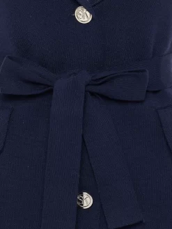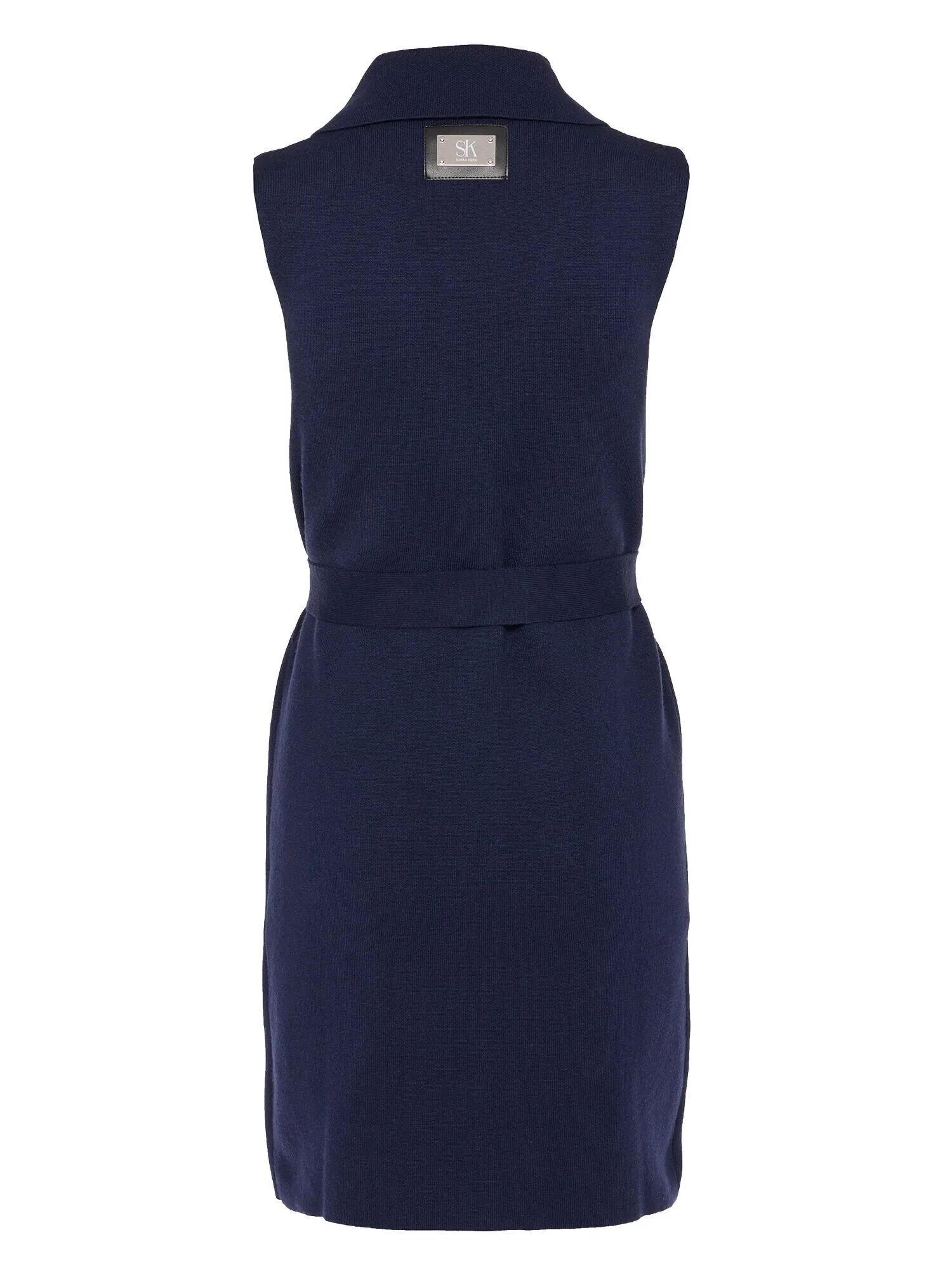 Die Strickweste in der Farbe Marine ist die ideale ErgĂ€nzung fĂŒr Ihren Kleiderschrank. Mit einem klassischen Kragen und einem Taillenband versehen, vereint sie schlichte Eleganz mit vielseitiger FunktionalitĂ€t. Die zeitlose Marinefarbe macht sie zu einem einfach zu kombinierenden KleidungsstĂŒck fĂŒr unterschiedliche AnlĂ€sse.Â
