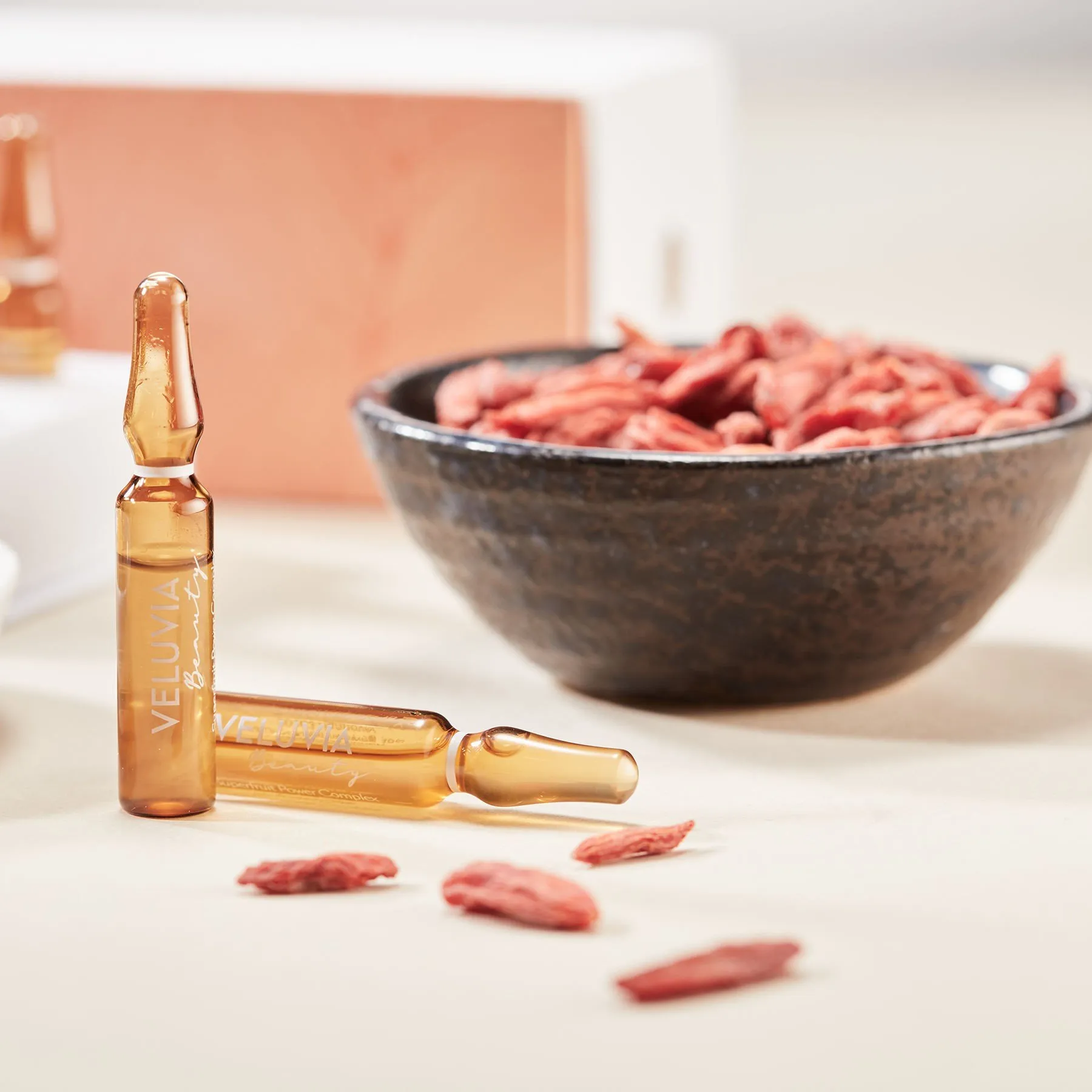 Die VELUVIA BEAUTY AMPULLENKUR, der exotische Beauty-Smoothie für die Haut. Die feine Formulierung dieser fruchtigen Power-Wirkstoffkombination hat eine einzigartige antioxidative Wirkung und schützt die Haut so optimal vor freien Radikalen und vorzeitiger Hautalterung. Die Synergie aus einem besonderen Superfruit Komplex, dem Extrakt der Camu Camu Beere und der Gojii Beere, verleiht der Haut einen besonderen Healthy Glow und mindert sichtbar Zeichen von Hautermüdung, wie dunkle Augenschatten. Die Elastizität der Haut wird spürbar verbessert, feine Linien und Falten erscheinen optisch geglättet. Die Haut wirkt vitalisiert und erstrahlt mit neuer Energie in ihrer natürlichen jugendlichen Schönheit.