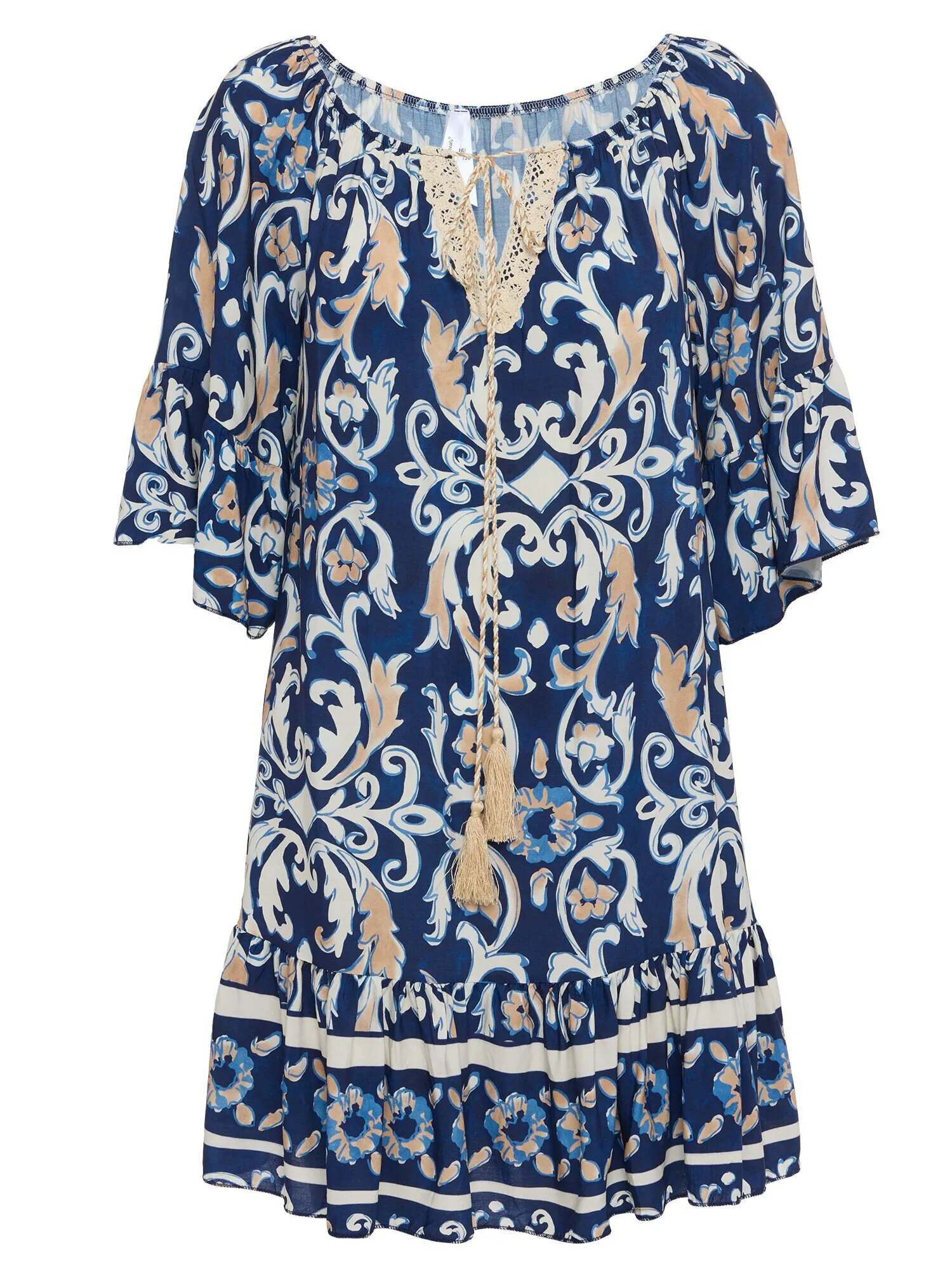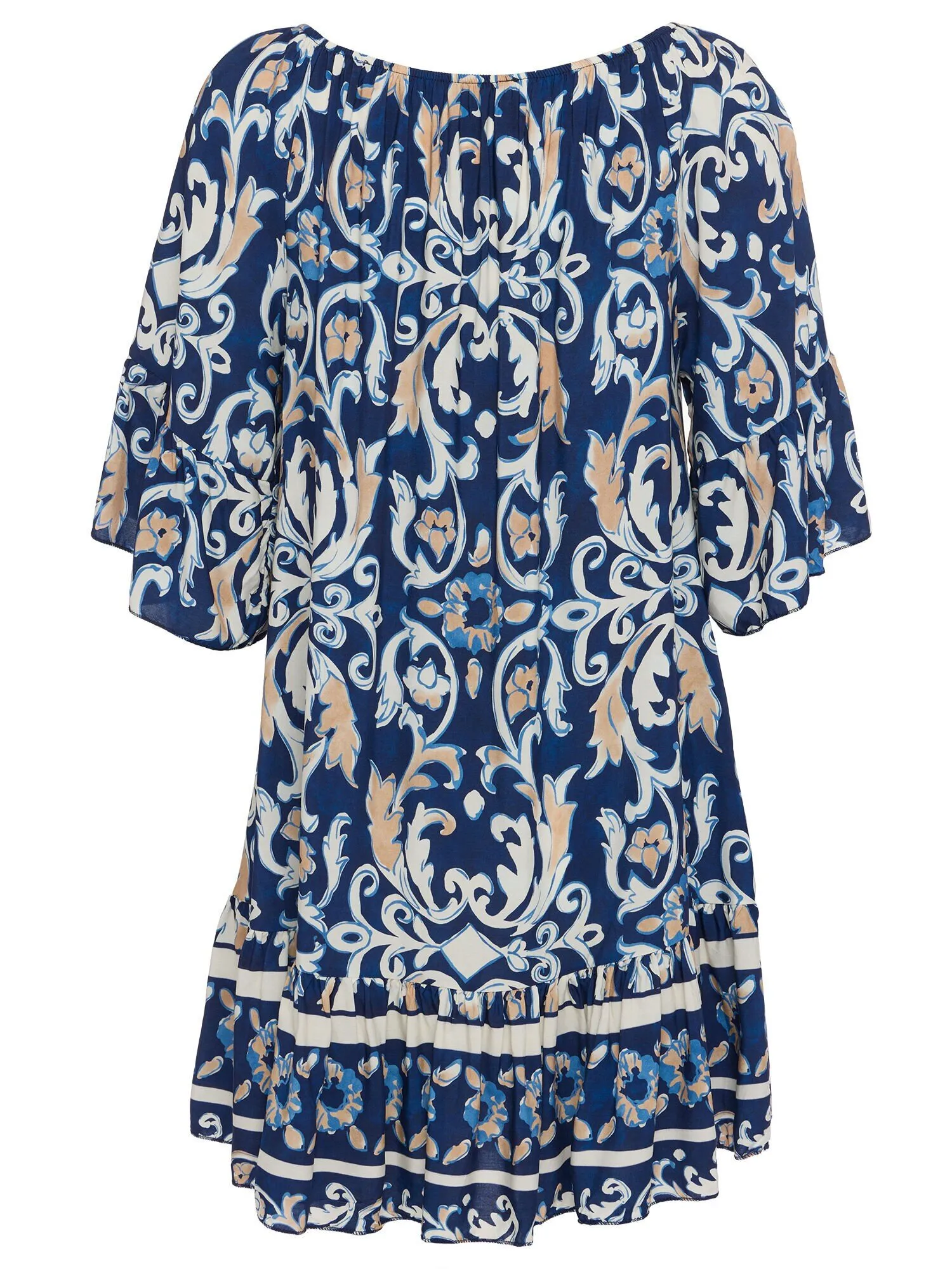 Die tiefblaue Farbe harmoniert perfekt mit dem opulenten Barockprint, der einen Hauch von königlichem Flair versprüht. Hergestellt aus hochwertiger 100 % Viskose bietet diese Tunika ein angenehmes Tragegefühl und eine luftige Leichtigkeit.