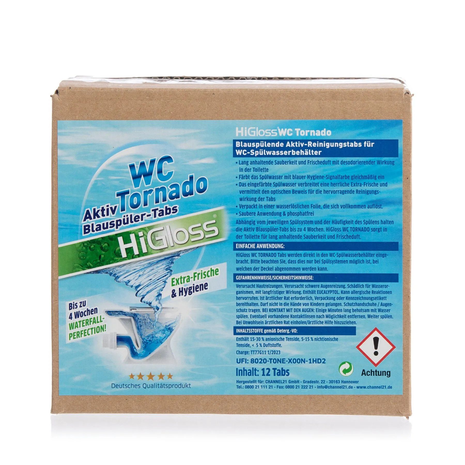 Die HiGloss WC-Tornado Tabs sorgen in Ihrer Toilette für langanhaltende Sauberkeit und einen angenehmen Frischeduft. Die Aktiv-Reinigungstabs für den WC-Spülwasserbehälter färben Ihr Spülwasser in ein hygienisches Blau und machen es nicht nur zur kräftigen Reinigungslösung, sondern geben jedem Gast in Ihrem Zuhause den optischen Beweis für die hervorragende Reinigungswirkung von HiGloss WC-Tornado.