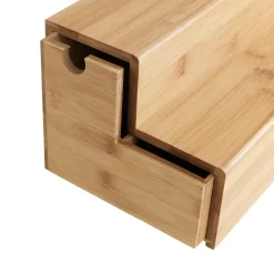 Die praktische Bambus Treppe für Kaffee und Tee schafft Ordnung im Küchenschrank und auf der Arbeitsplatte. Das hochwertige Regal mit zwei Stufen hat eine beidseitig ausziehbare Schublade. Darin lassen sich übersichtlich und vor Blicken geschützt Tee und Kaffee-Pads oder Kaffee-Kapseln aufbewahren. Der Küchenorganizer schafft auf den Treppen dekorativen Platz für Tassen, Gewürze und anderes Zubehör. Das kleine Küchenregal ist aus Bambus gefertigt, welches nicht nur hart und widerstandsfähig ist, sondern auch unter ökologischen Aspekten klare Vorteile bietet. Bambus ist ein schnell nachwachsender Rohstoff.