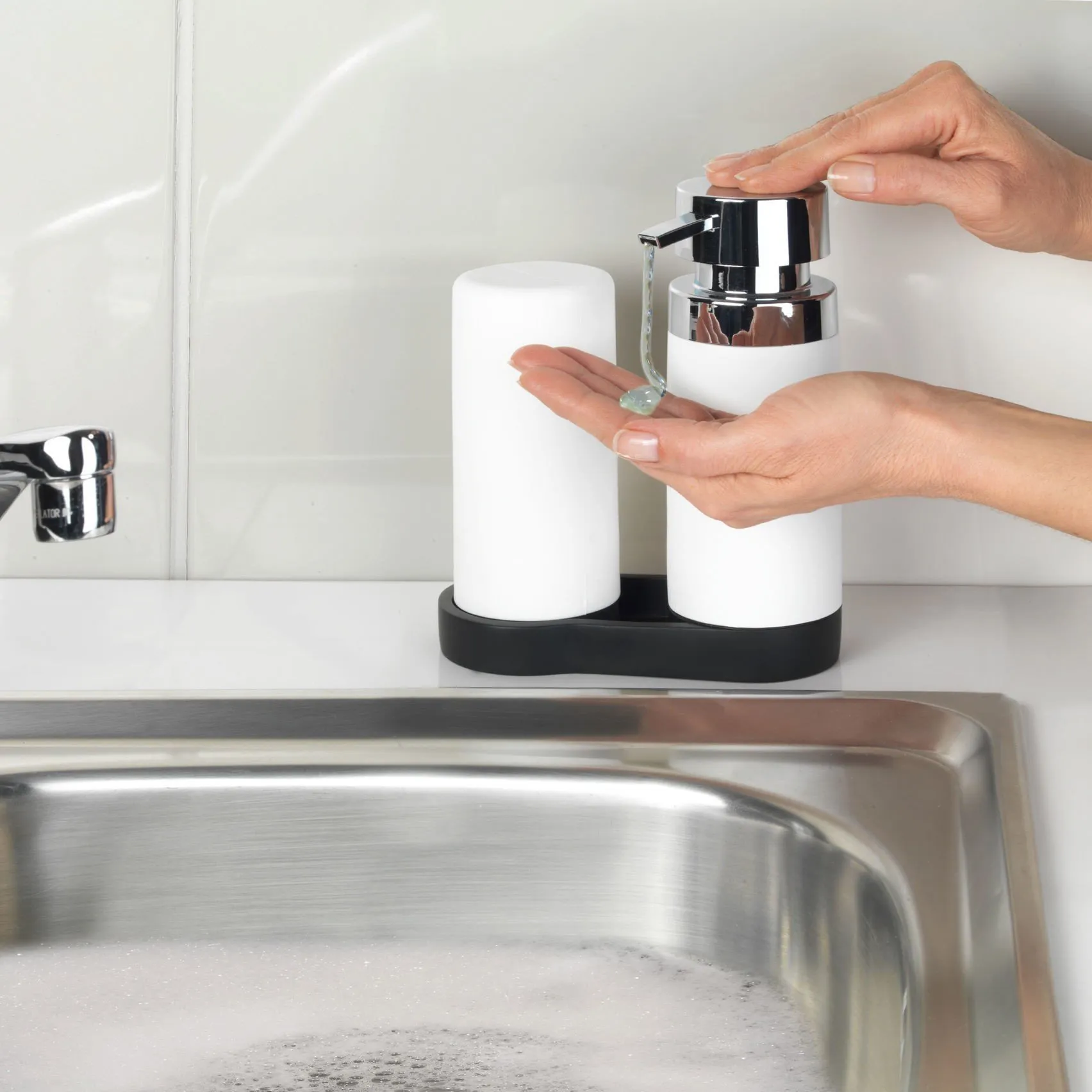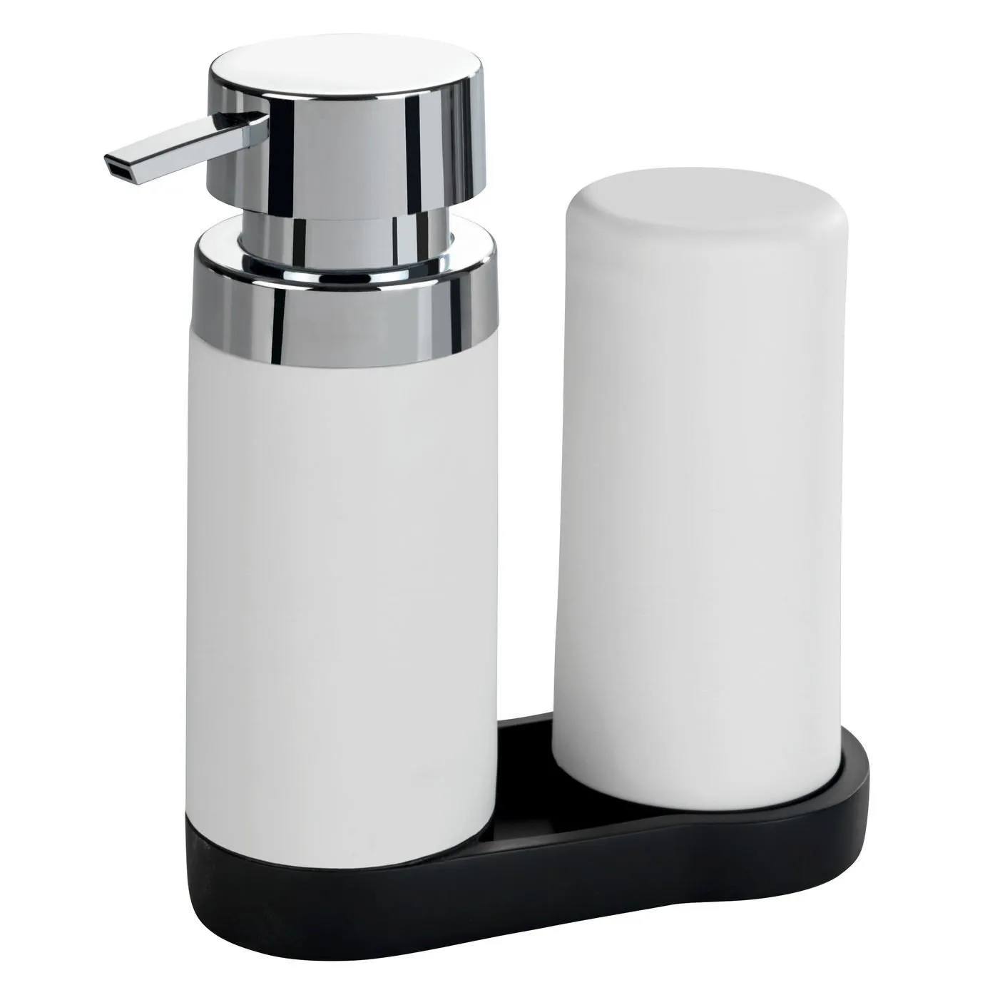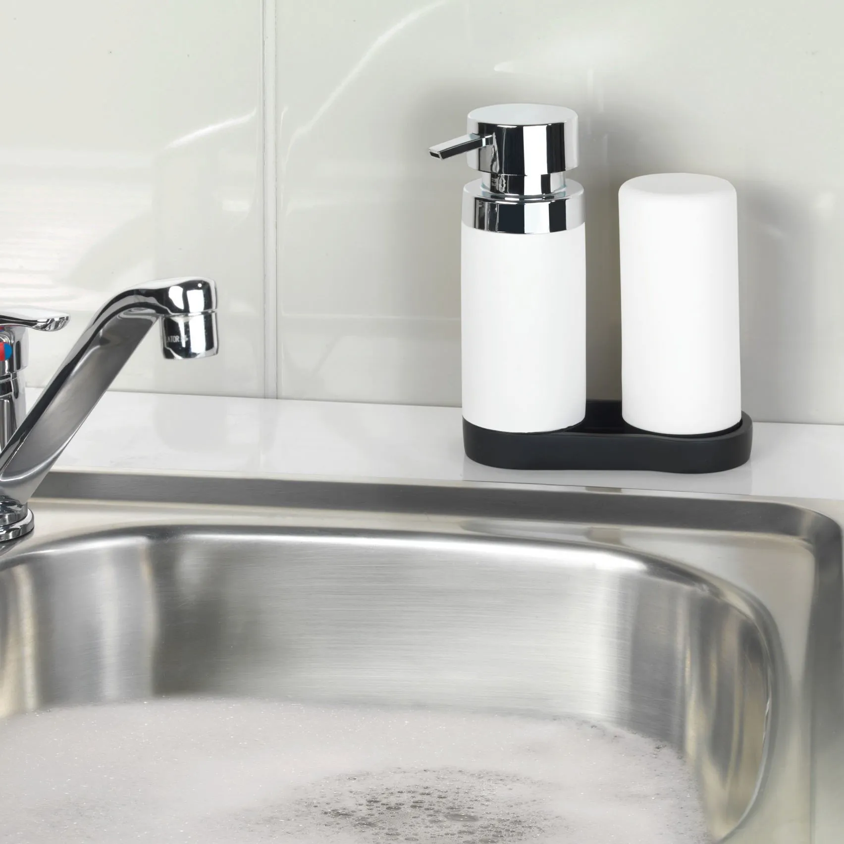Ordnung halten leicht gemacht – mit der praktischen Easy Squeez-e Spülstation von WENKO. Diese clevere Kombination aus Seifen/Spülmittelspender und Easy Squeez-e-Dosierer bringt im dezenten Weiß Stil und jede Menge Funktionalität in die Küche. Auf der Ablage werden beide Spender griffbereit am Spülbecken gehalten. Das schmale Design nutzt den engen Raum hinter den meisten Spülen voll aus.