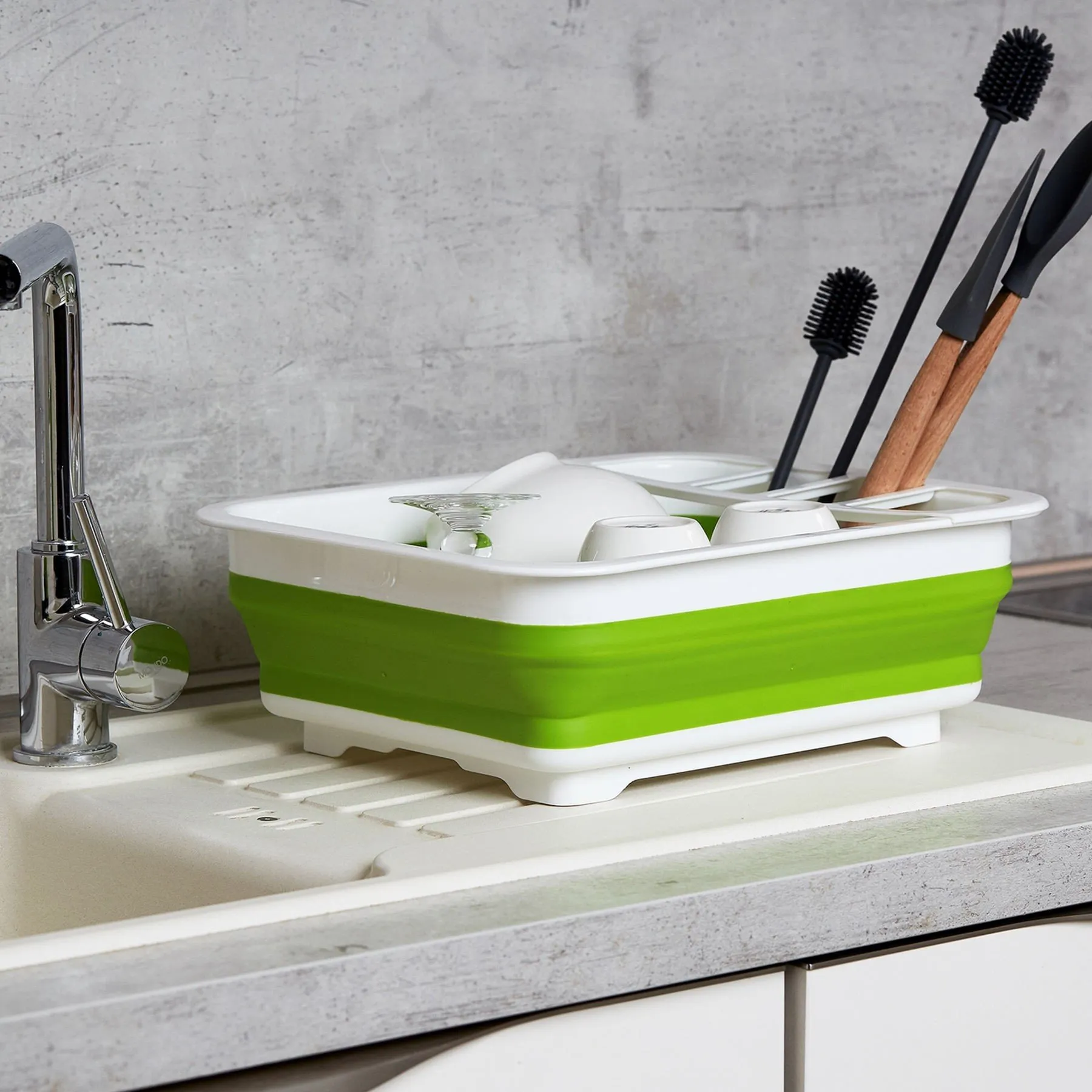 Das praktische Geschirrabtropfgestell aus flexiblem Silikon bietet mit seiner großen Ablagefläche viel Platz für Teller, Tassen, Messer und Gabeln. Da es auch im Zeitalter der Spülmaschine immer noch Geschirr und Besteck gibt, das besser von Hand gespült werden sollte, dient der Abtropfständer als funktionelles Zubehör für die Spüle in Küche, Gartenhaus oder Wohnmobil. Der Geschirrabtropfer ist rutsch- und kratzfest und bietet einen sicheren Stellplatz für Teller, Tassen und eine separate Vorrichtung für das Besteck. Der ausziehbare Ablauf vereinfacht das Abgießen von Wasser und erleichtert die Reinigung. Dabei bleibt die Arbeitsplatte stets trocken. Das handliche Abtropfgestell lässt sich bei Nichtgebrauch platzsparend zusammenfalten.
