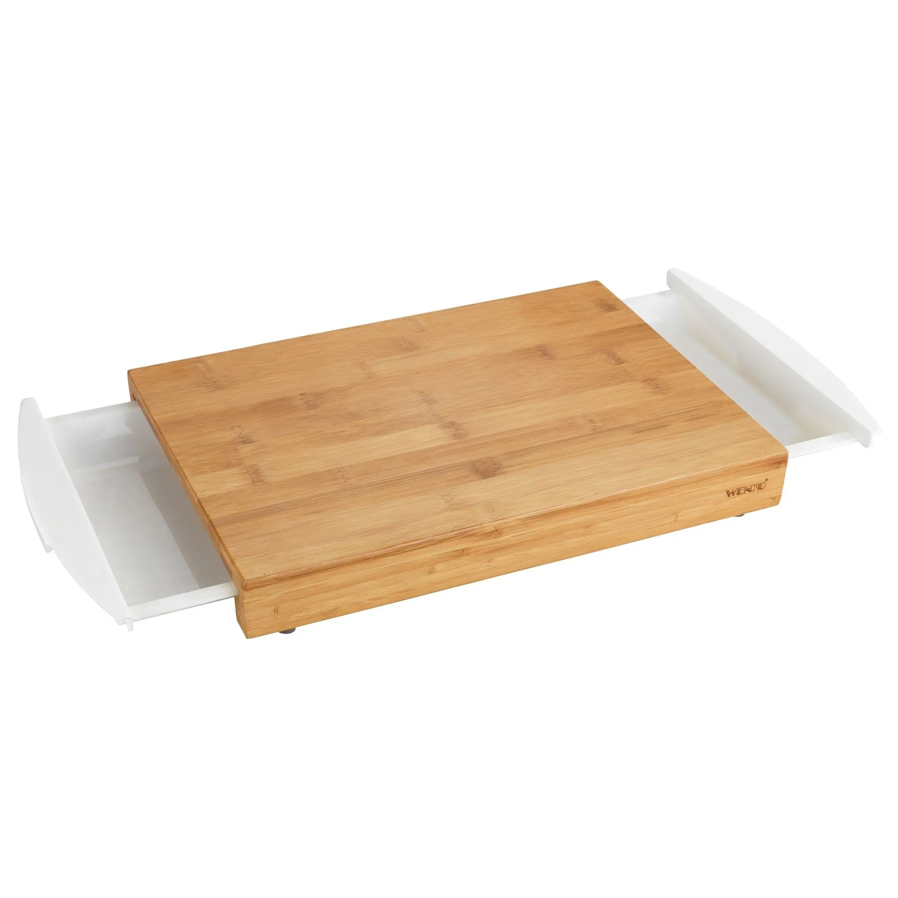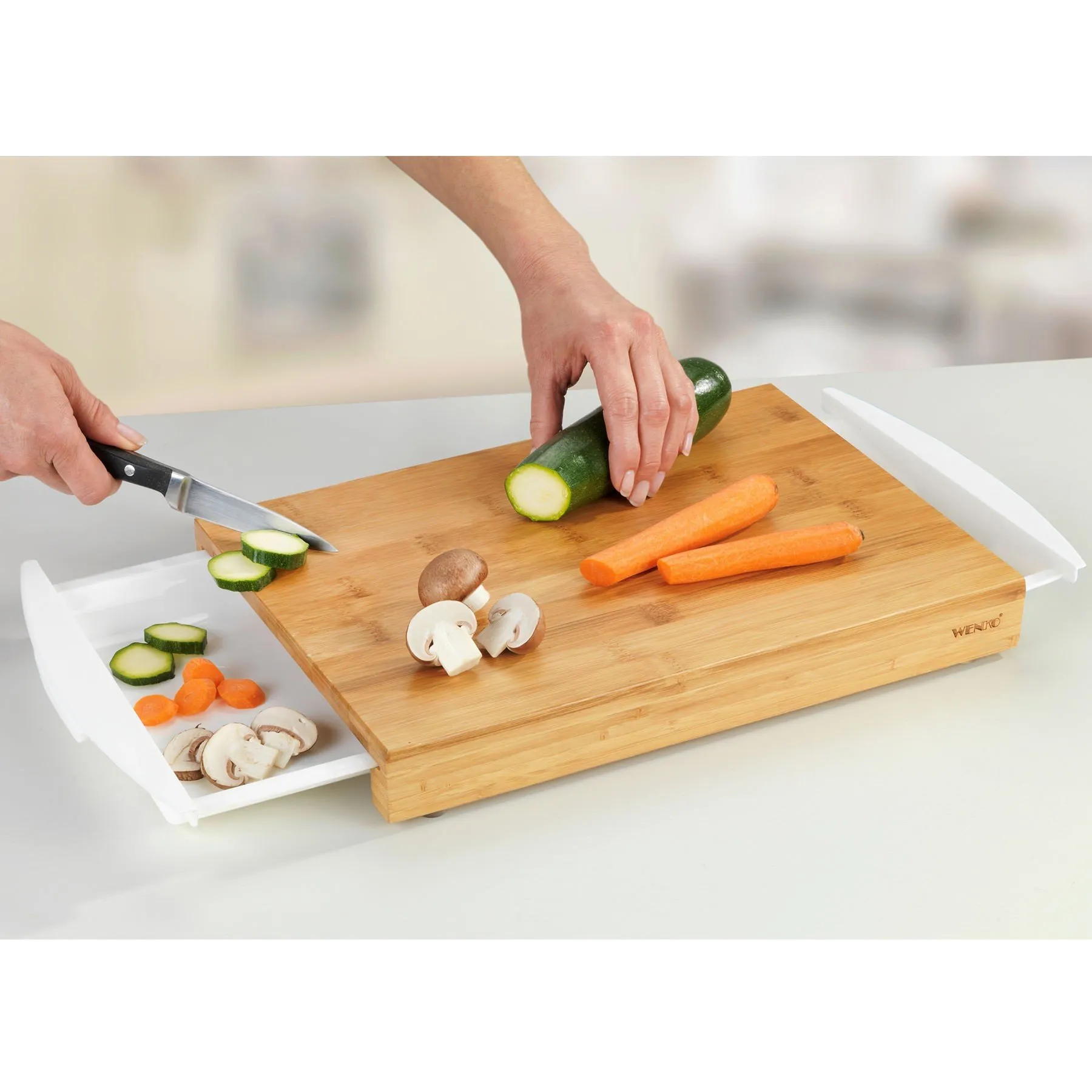 Mit dem hochwertigen Bambus-Schneidbrett Bina kann man sich die Arbeit in der Küche vereinfachen. Da macht Kochen und Backen gleich viel mehr Spaß! Das stabile Schneidebrett hat viele praktische Funktionen und eine hervorragende Qualität. Die zwei einzeln entnehmbaren Auffangbehälter eignen sich ideal zum Auffangen des Abfalles, wenn Obst oder Gemüse auf dem Bambus-Brett geschnitten werden. Die Schalen aus robustem Kunststoff sind in das Brett integriert und können bei Bedarf ganz einfach an jeder Seite ausgezogen werden. Die Schneide-Abfälle landen so direkt in einer der Schalen und die Arbeitsplatte bleibt sauber. Parallel können Sie auch die geschnittenen Köstlichkeiten auf das andere Tablett schieben und dieses zum Servieren entnehmen. Die Auffangschalen können nach Gebrauch bequem gereinigt werden. Die Bambusplatte dient auch als ideale Unterlage beim Teigkneten und -ausrollen. Besonders geeignet ist sie auch als Tranchier- und Schneidebrett für Fisch, Fleisch oder Gemüse. Natürlich kann das Schneidbrett auch direkt als dekorative Servierplatte genutzt werden. Für einen sicheren Stand verfügt das Bambus-Schneide-Brett über vier rutschfeste Silikonfüße. Das Allround-Talent für die Küche ist aus Bambus gefertigt, welches nicht nur hart, messerschonend und widerstandsfähig ist, sondern auch unter ökologischen Aspekten klare Vorteile bietet. Bambus ist ein schnell nachwachsender Rohstoff.