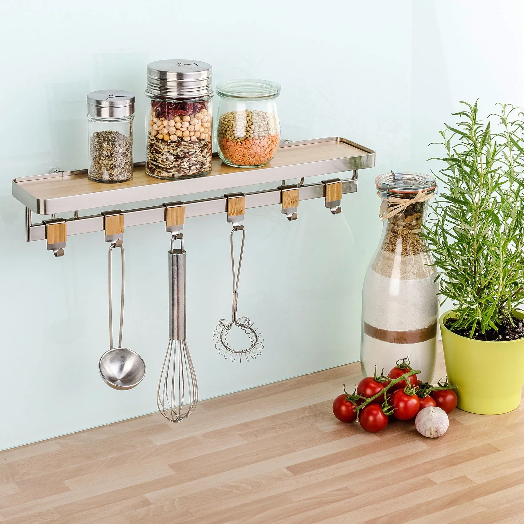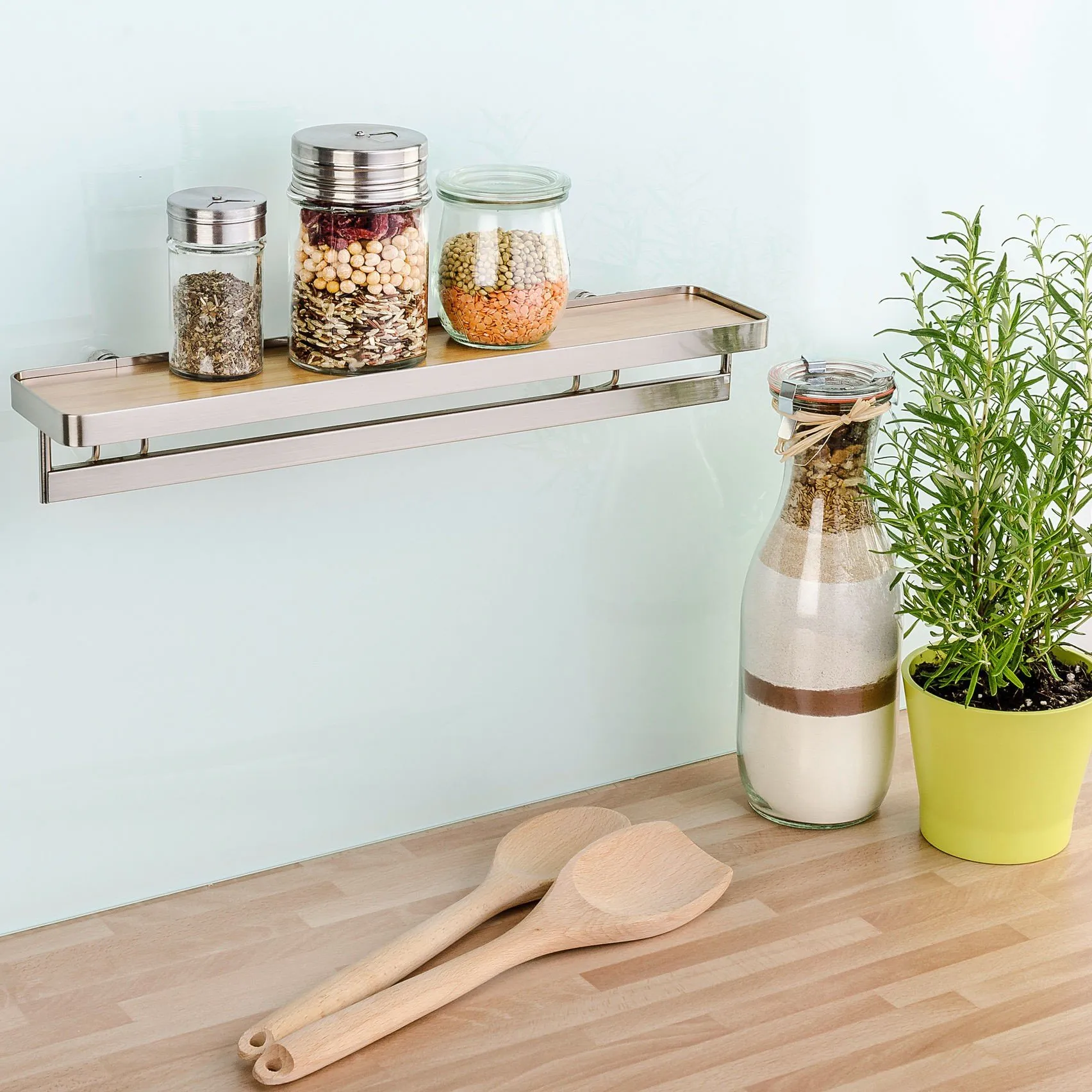 Zusätzlich ist die Gewürzablage mit einer praktischen Reling versehen, an welcher weitere Küchen-Utensilien wie Schneebesen, Kochlöffel, Suppenkellen und vieles mehr aufgehängt werden können. Das macht das Gewürz-Bord zu einem nützlichen Helfer in jeder Küche.